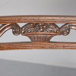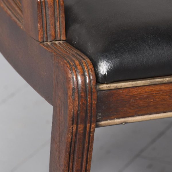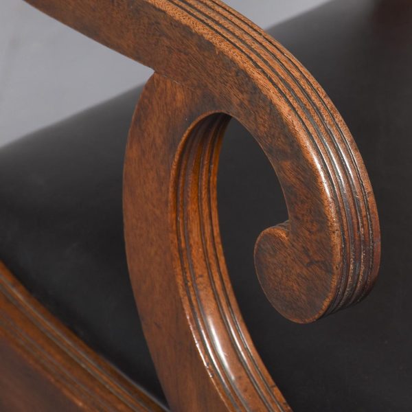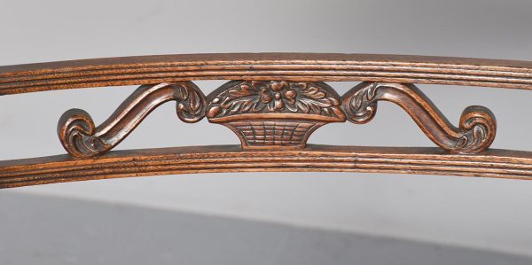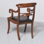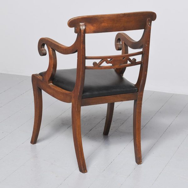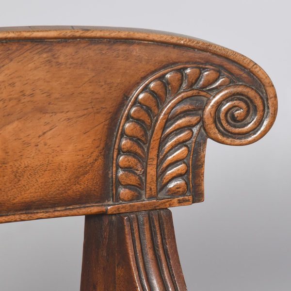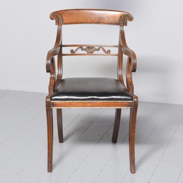 Circa 1815. An interesting stylish Regency mahogany armchair. The curved, shaped and carved top rail, with a wonderfully carved back beneath, including a basket of flowers and rococo carving, held in place by two shaped, ribbed bars. Stylish ribbed arms supported on curved and shaped uprights. Large drop-in seat pad, with the ribbing continuing on all of the facings of the chair, with gilded brass rail beading in the front seat rail, back legs are out swept, front legs front legs are saber shaped.