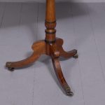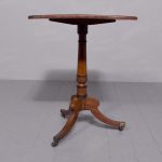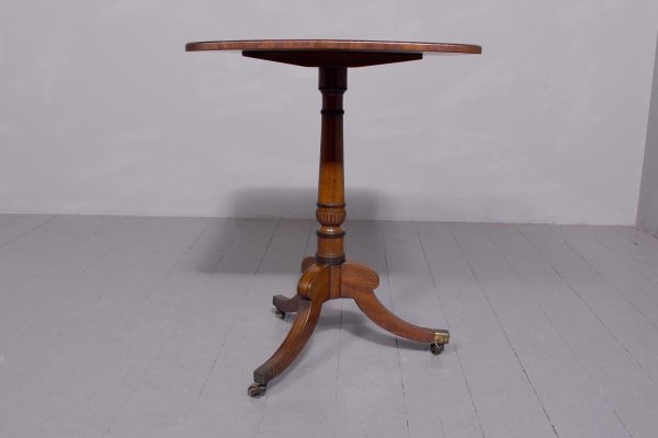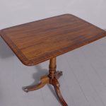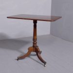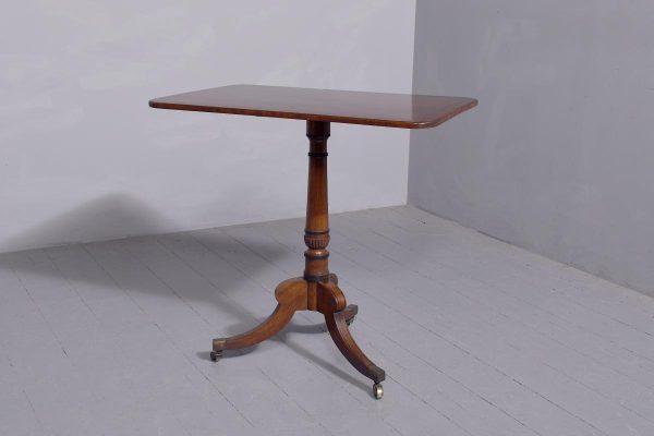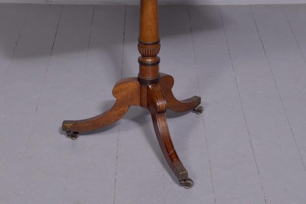Circa 1850. A quality Regency mahogany and inlaid side table, the rectangular top with rounded corners in fine figured mahogany with double banding of ebony and broad banding and a simple chamfered fore edge, resting on a classic turned canon barrel stem with ebonized sections and a small fluted urn towards the base with further ring turning, issuing three hipped ebony inlaid saber legs finishing with the original cast brass block with the brass castors beneath. Table has recently been repolished (traditionally).