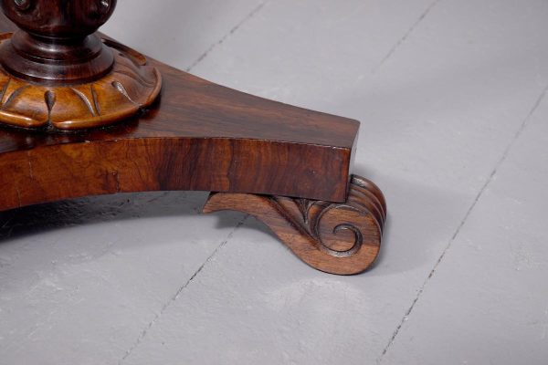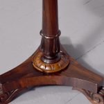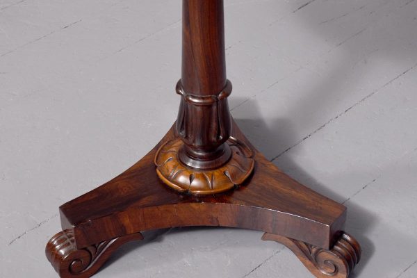 The top in figured Brazilian rosewood with crossbanded sides and supported on a tapering stem with a canted carved base and collar above a tripartite platform base on scroll supports.