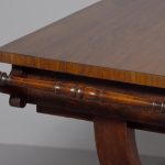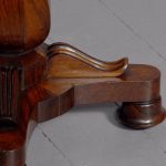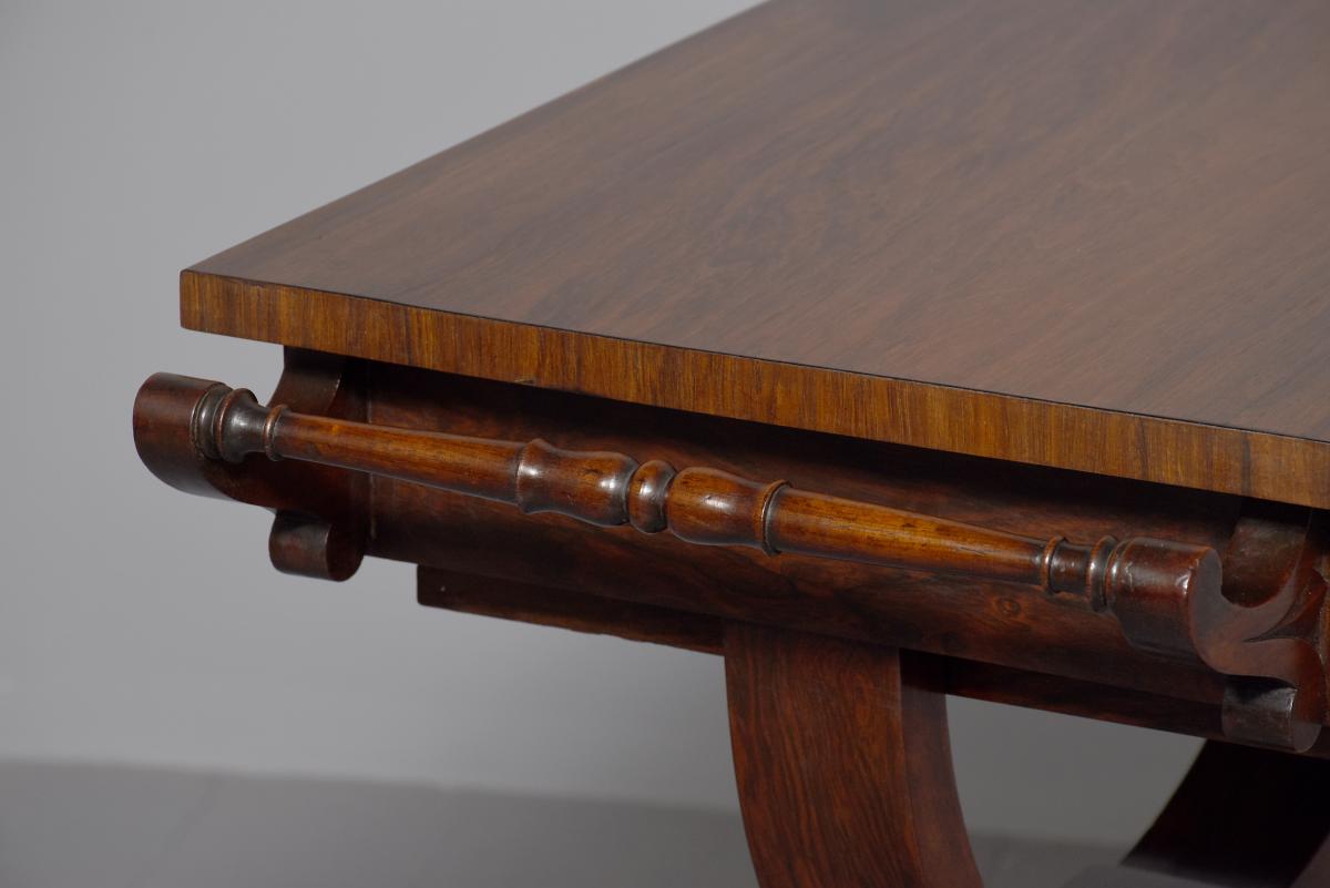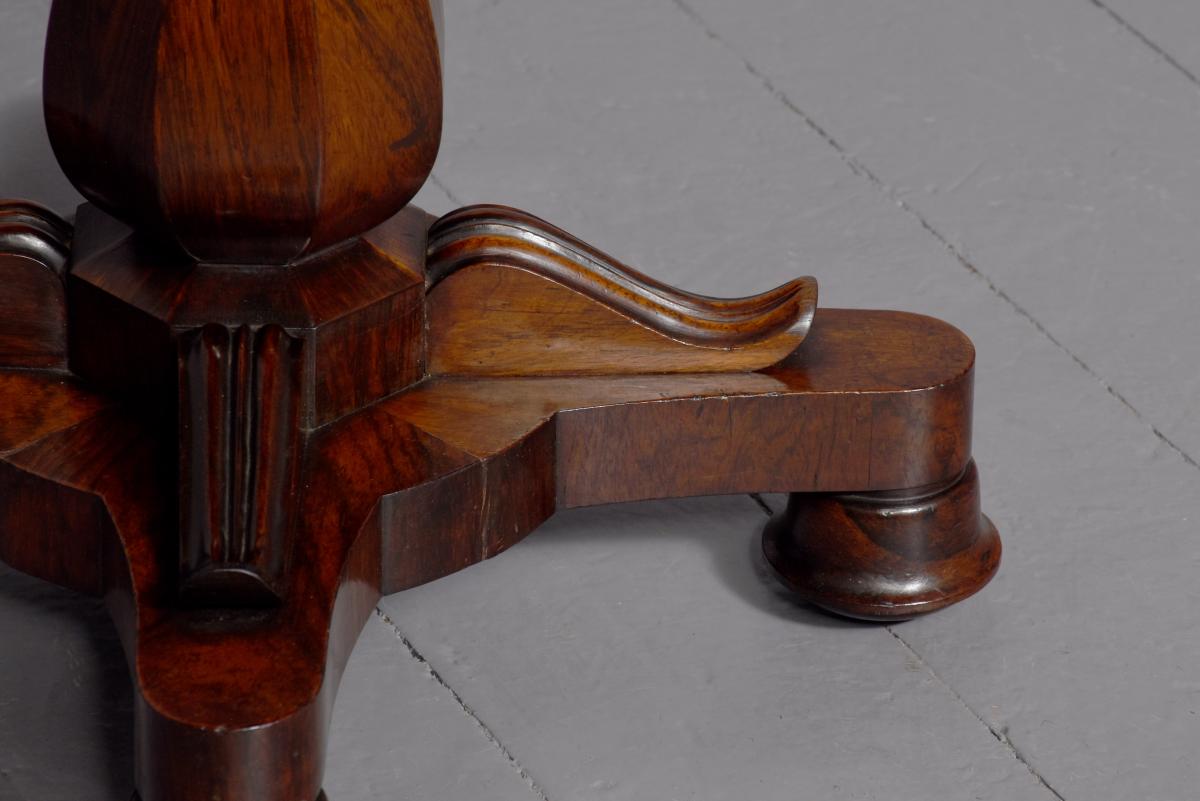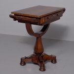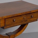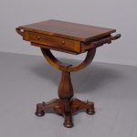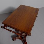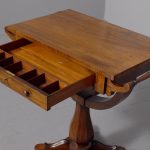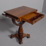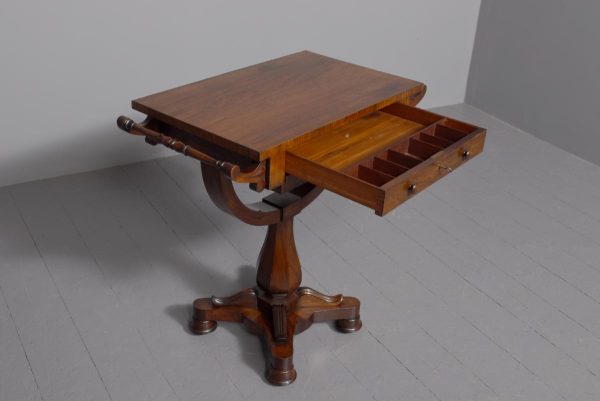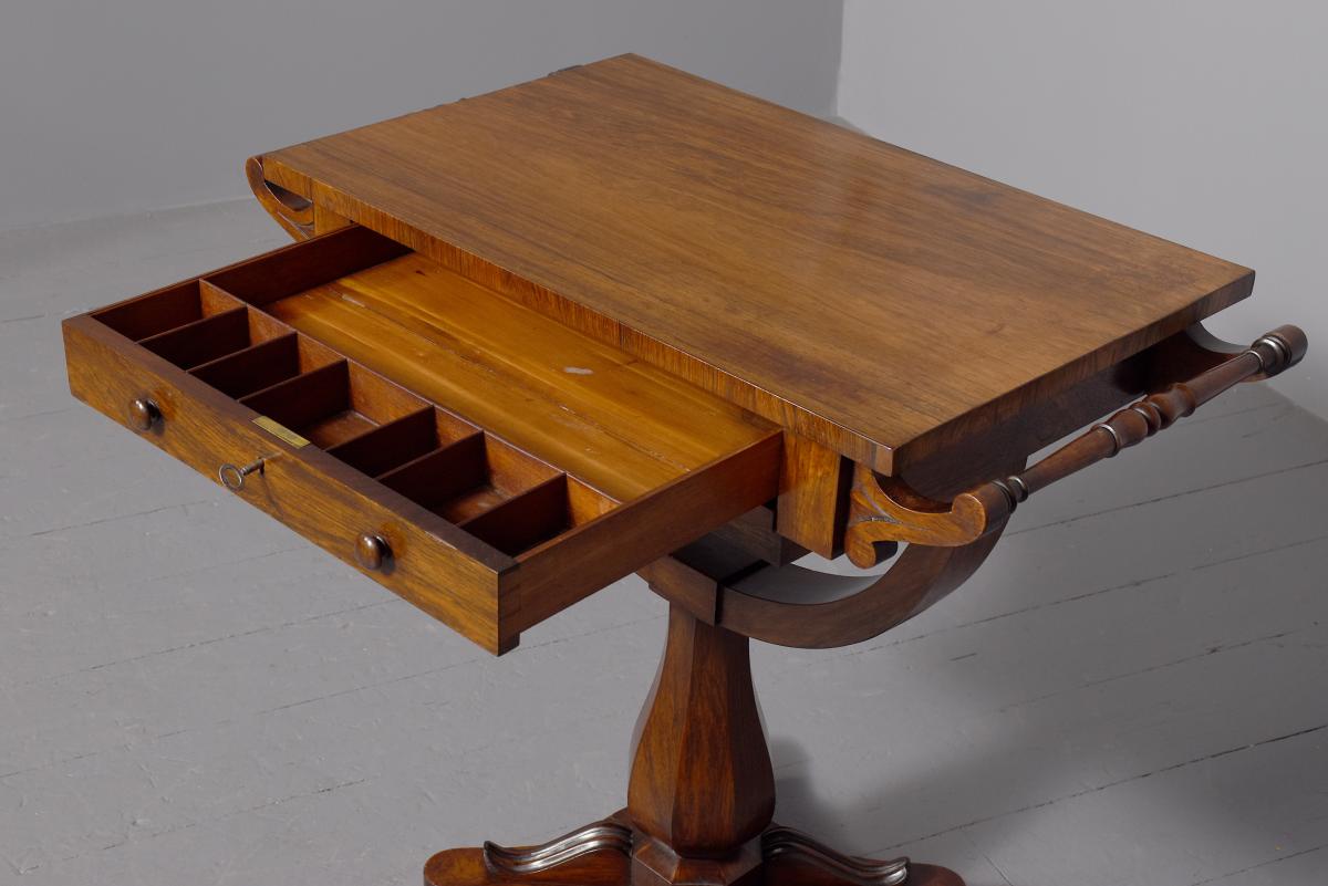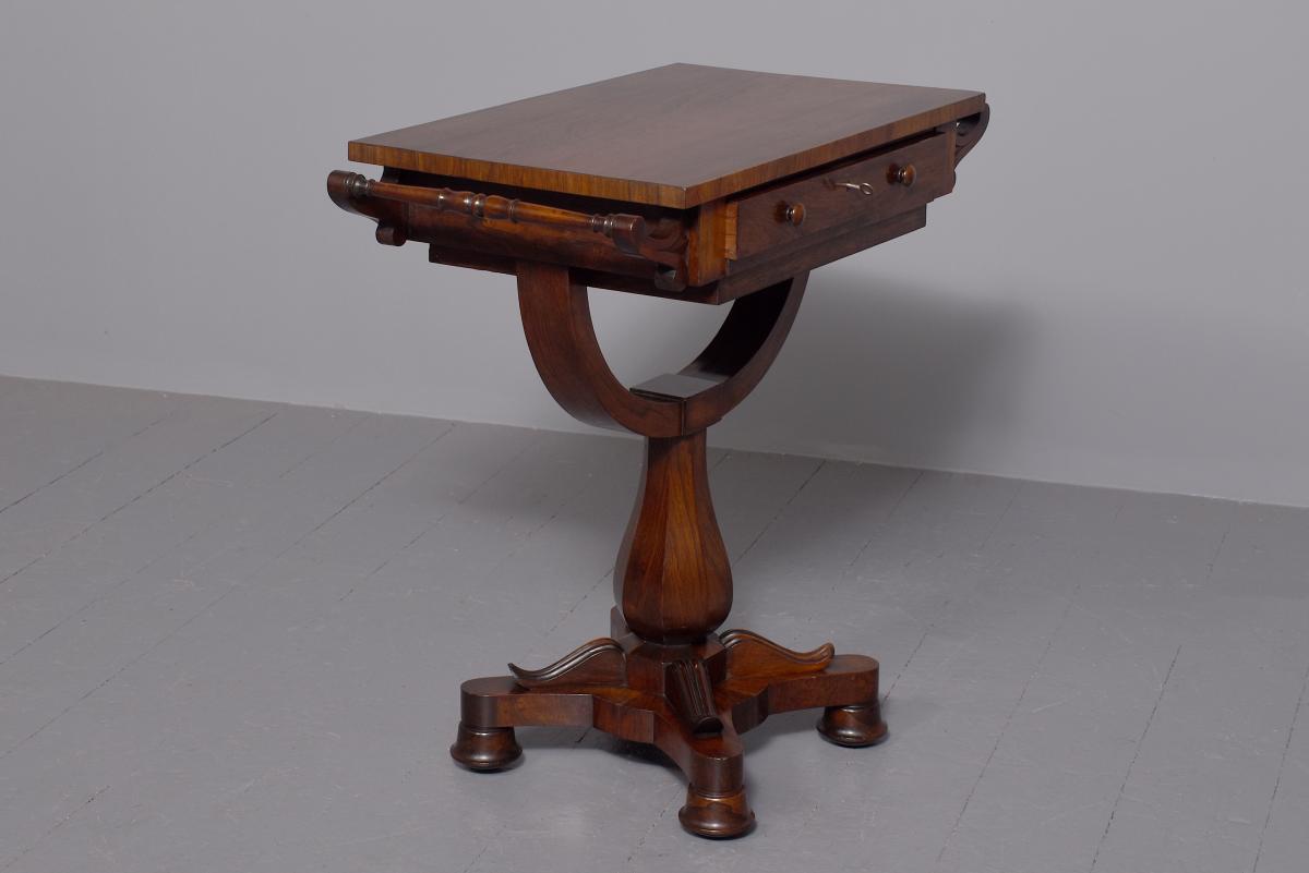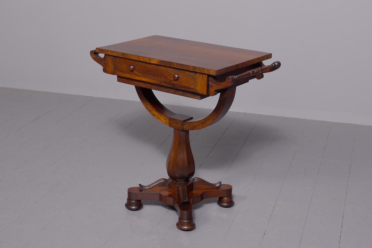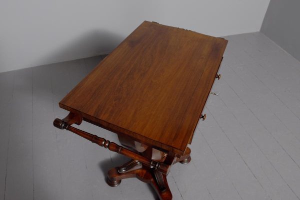 Circa 1820. Regency Rosewood free-standing side or lamp table. The rectangular top in figured rosewood with crossbanded fore-edges and two turned carrying handles. With a frieze drawer to the front with original lock and key and finely turned knobs and faux drawers on the rear. On an arched support with a bulbous hexagonal stem and quadripartite base with turned feet with hidden original brass castors