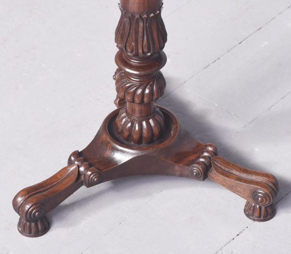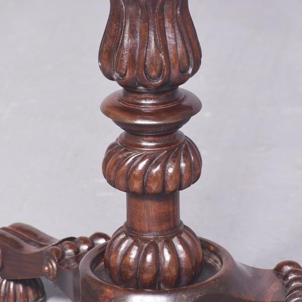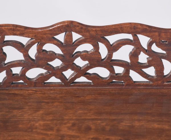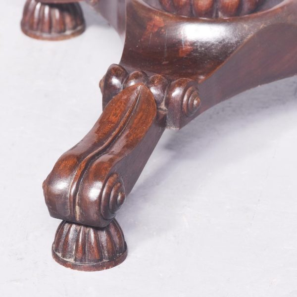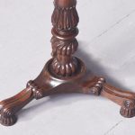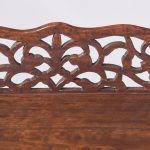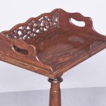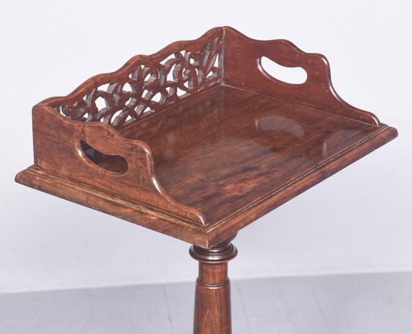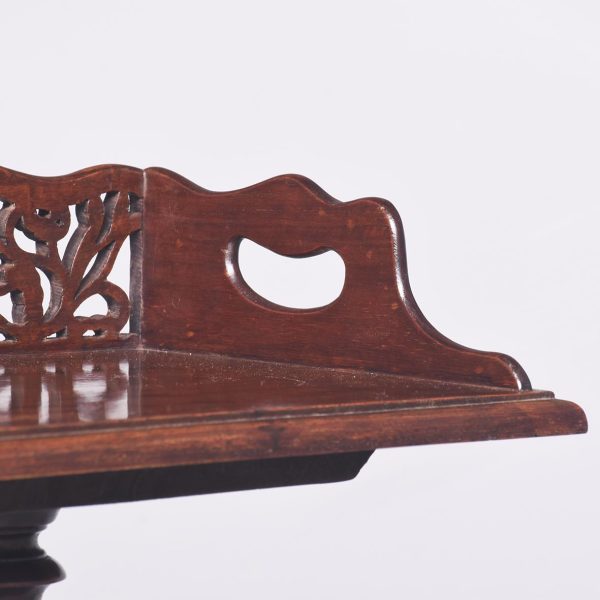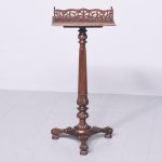 Circa 1970s. A Regency style bookstand with a solid top with moulded fore-edge with pierced gallery to the back and shaped gallery with lifting handles to the sides. The top resting on an elegant turned ring turned tapering stem with foliate carving and a twisted urn and dragooning, resting on a stylish carved triform base with carving, three scrolling feet with acanthus leaves on top, all resting on three squat fluted carved feet.