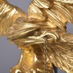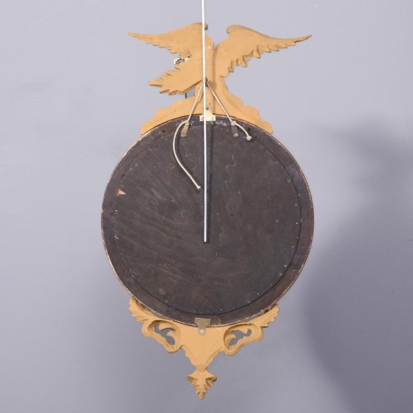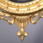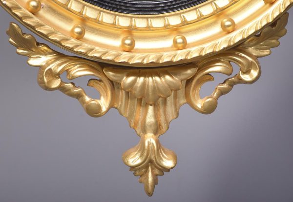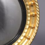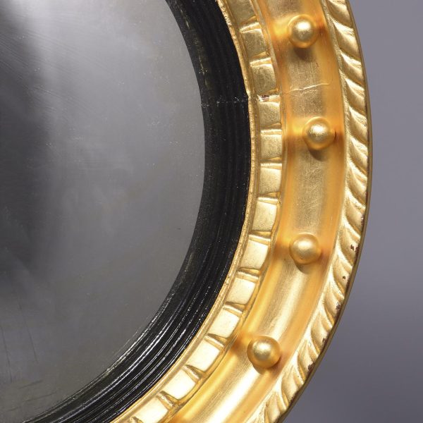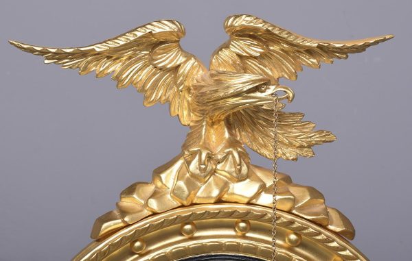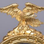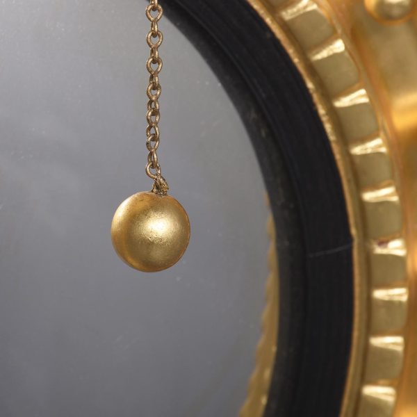 Circa 1950s. A good Regency style gilded convex mirror. The top surmounted by a gilded and carved eagle with outspread wings, a chain and ball hanging from its beak, with his talons clasping a rocky base. The convex mirror held in place in an ebonized ribbed slip with a moulded frame including dragooning, gilded balls and further carving. The base with pierced foliate carving and a downward facing finial.