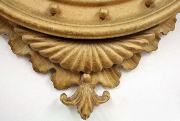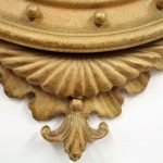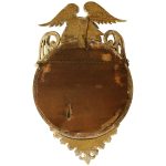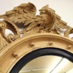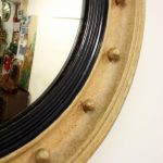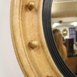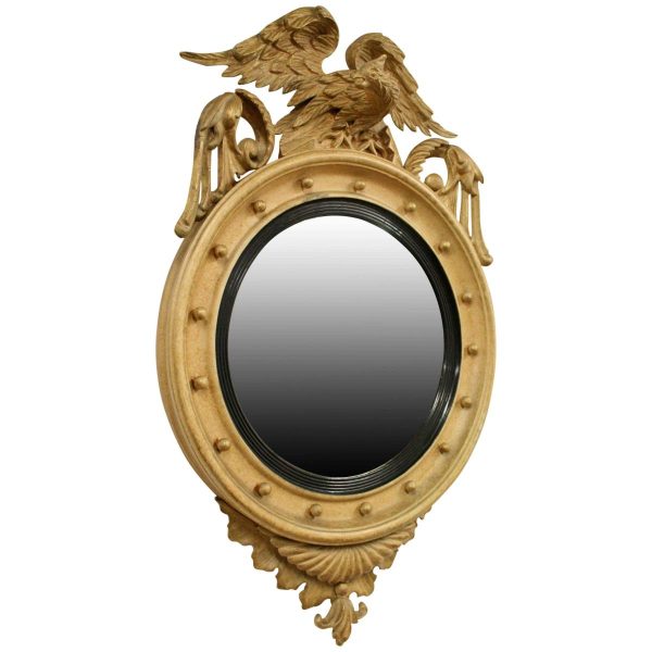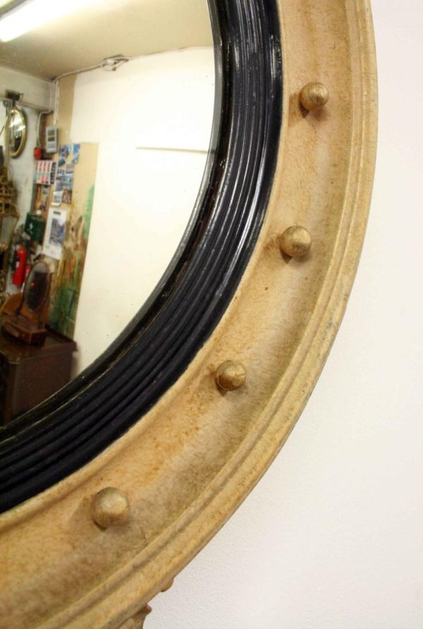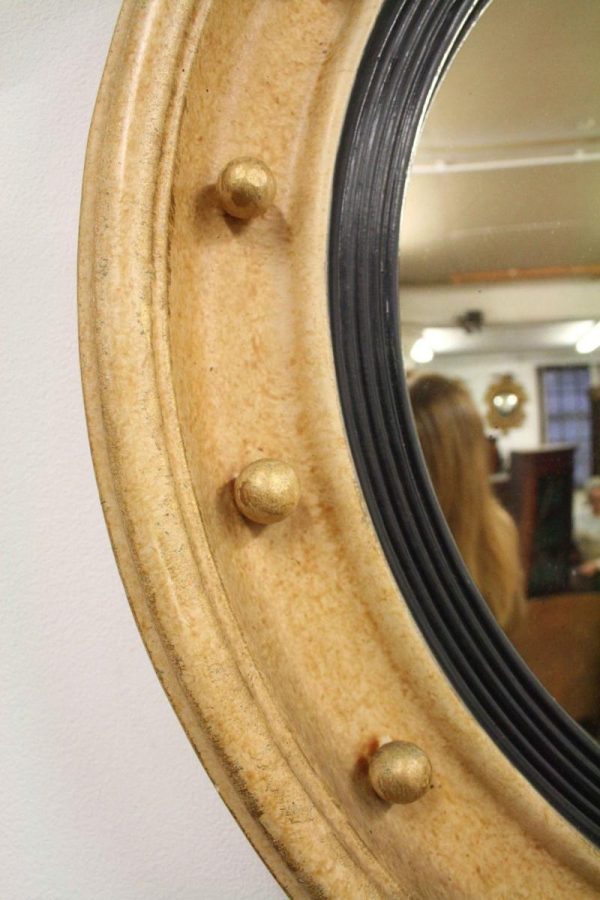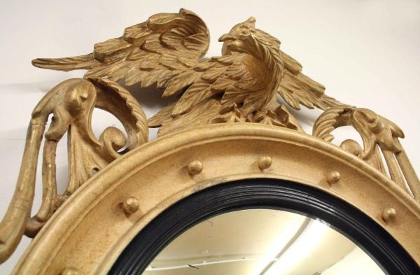 Circa 1880, Regency style gilt convex mirror. The mirror has been gilded and scumbled, and has a ribbed black bezel. It is surmounted by a large carved mythical Ho Ho bird, and open foliate carving. At the bottom is a scalloped ribbed carving backed by a foliate carving, finishing with downward cut fleur de lis. Good colour and condition.