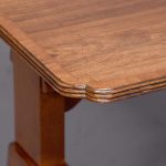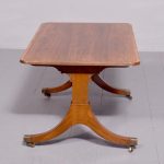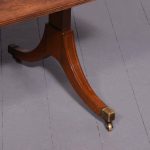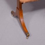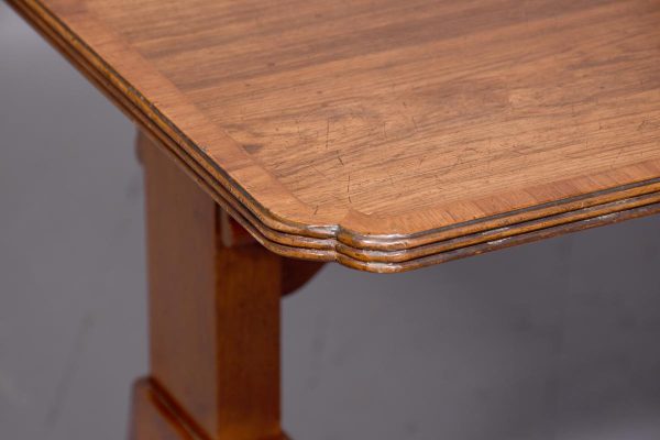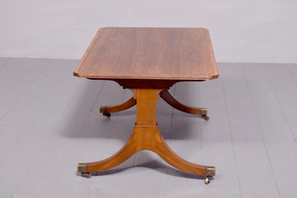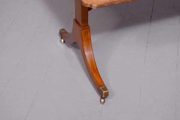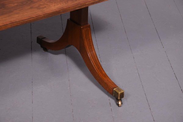 Circa 1920. An interesting and unusual Regency style coffee table, the top in well figured rosewood with string and kingwood cross banding and re-entrant corners and a ribbed fore-edge, supported on a pair of trestle ends with quarter blocks to the top, resting on four inlaid saber legs, finishing with a brass block and original brass castors beneath.