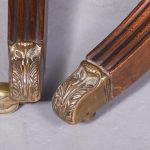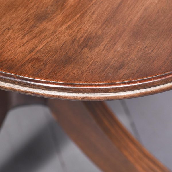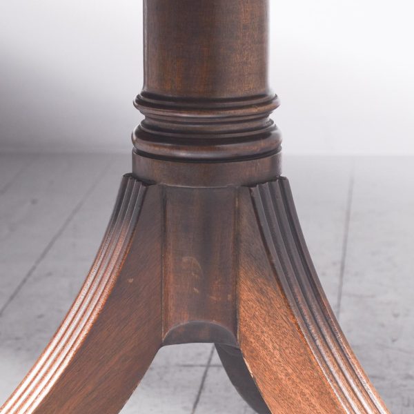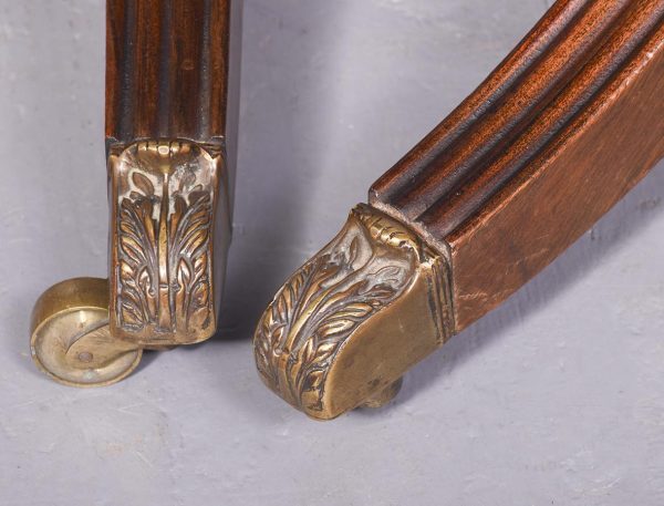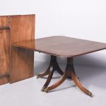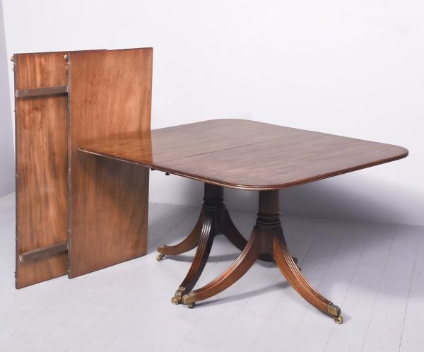 Circa 1920s. A quality Regency style twin pillar dining table plus two extra original leaves. The tops with rounded corners and a stylish reeded fore edge, the tops rest on a pair of cannon barrel stems, each issuing three reeded saber legs finishing on a cast brass acanthus covered toe, with brass castors beneath. The two original extra leaves are held in position by brass clasps and mahogany runners, the table can be used in three different combinations. With wonderful colour and patination, the table is clean and sturdy.