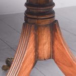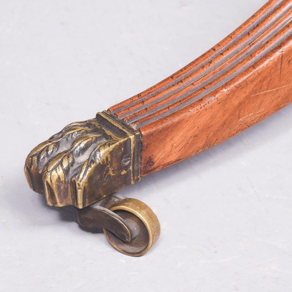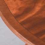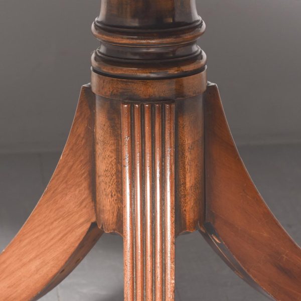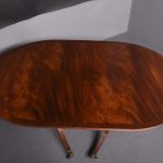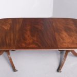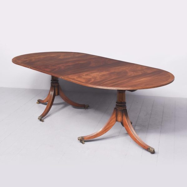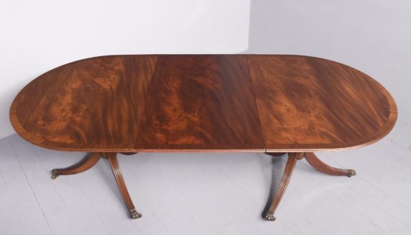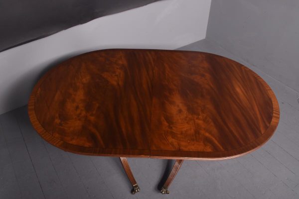 Circa 1930s. A Regency style mahogany twin pillar dining table with one original leaf. The top in flame mahogany with ebony inlay and broad crossbanding and a reeded fore-edge, the tops rests on stylish elegant turned and tapering columns issuing three ribbed saber legs, finishing with a brass toe with brass castors beneath. The original extra leaf is held in place by dowels, and brass clasps.