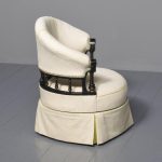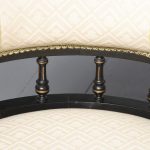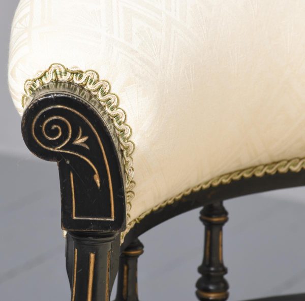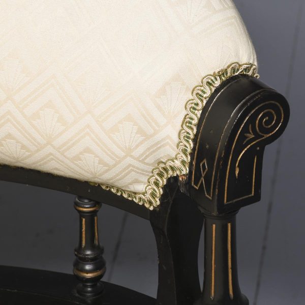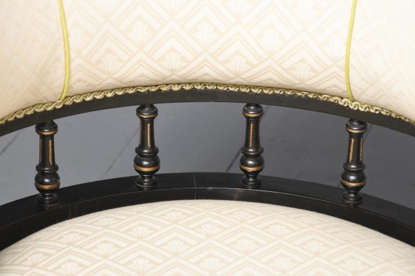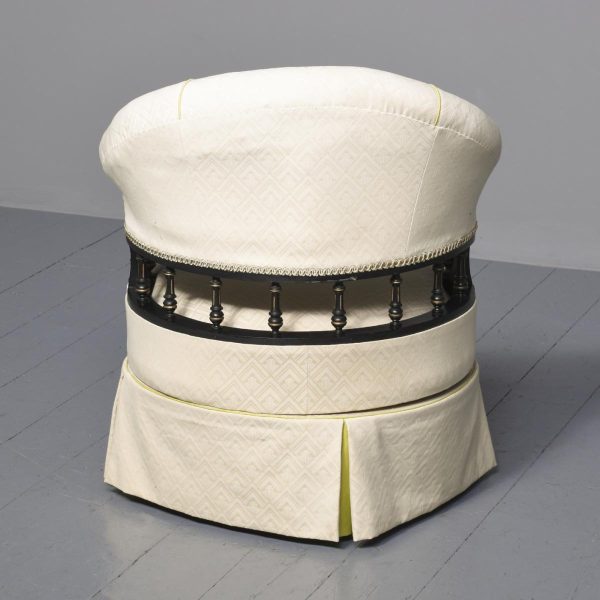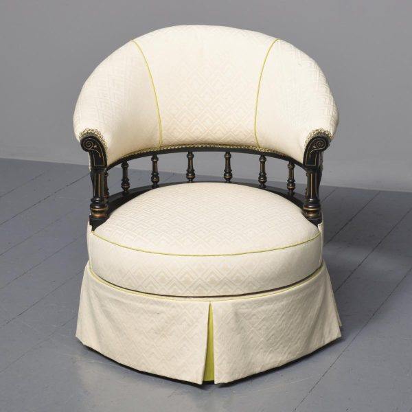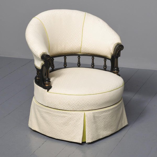 Circa 1890. An unusual late Victorian upholstered and ebonized framed revolving occasional chair. The curved upholstered back is supported by eight ebonized and gilded spindles with a gilded and timber frame to the facings, at the bottom of the seat there is an upholstered skirt which conceals the revolving mechanism. Standing on four elegant ebonized turned gilded and tapering fluted feet, finishing with a brass and porcelain caster.