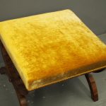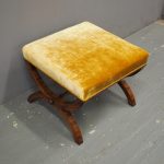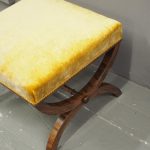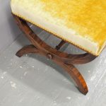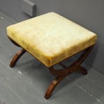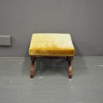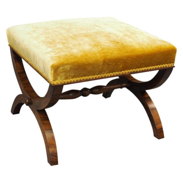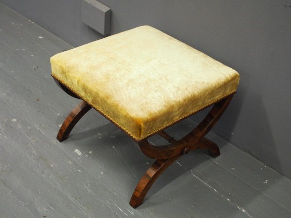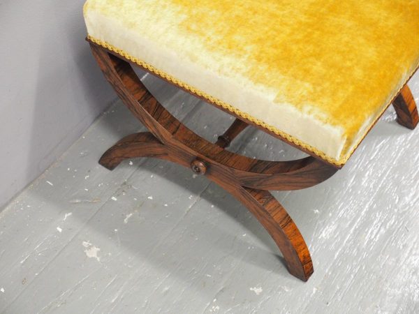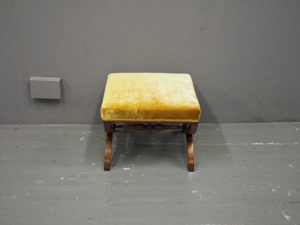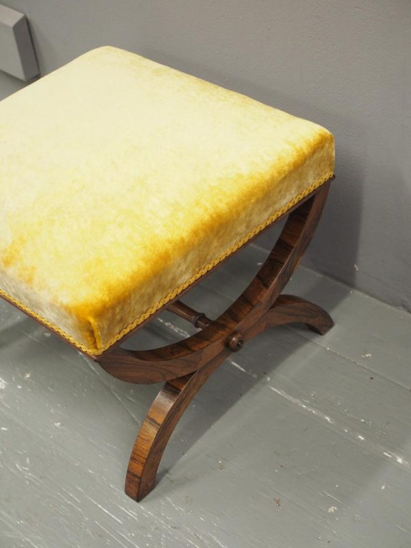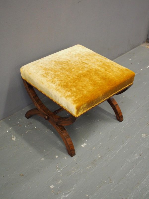 Circa 1820, rosewood square X framed stool. Recently re-upholstered in a gold velour finishing with braiding above a simple moulding that continues around all sides. Standing on a curved X frame, with a curved roundel or button to the centre of each end, supporting the turned and tapering stretcher. The whole stool is on a beech frame.