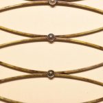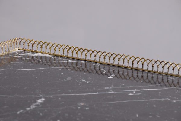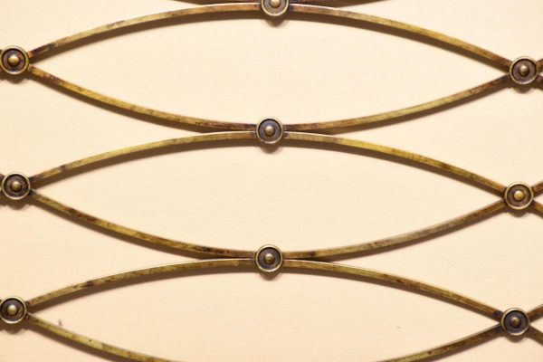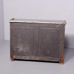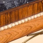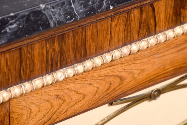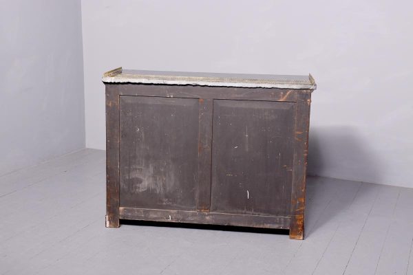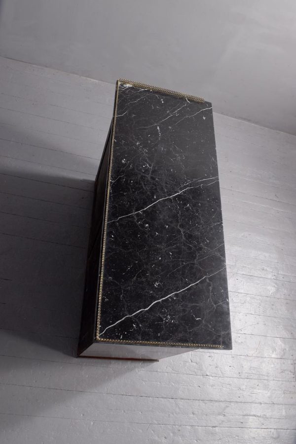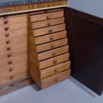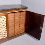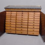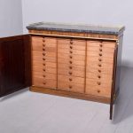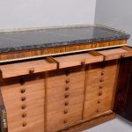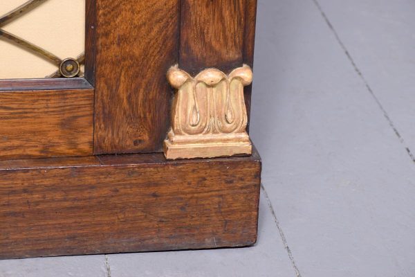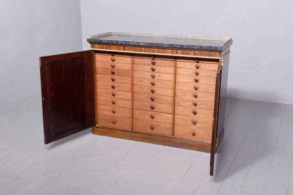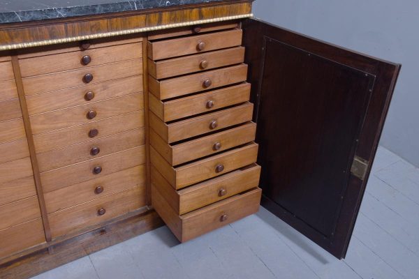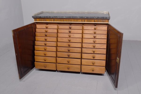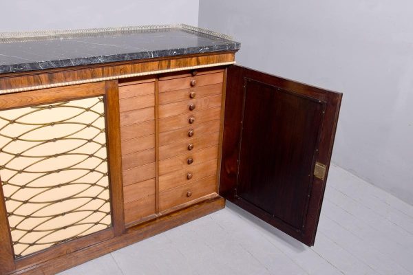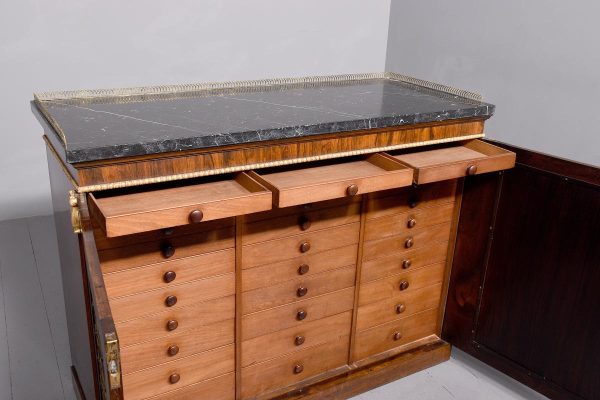 Circa 1815. A fine Regency marble-topped collectors cabinet with brass interlaced Gothic pointed arches, above a reverse ogee-moulded cornice and plain frieze with gilded bead-and-reel lower trim, the two doors with interlaced brass grills and later silk panels open to thirty graduated mahogany drawers arranged in three columns, the doors are flanked by mahogany pilaster topped with acanthus capitals with gilded a with lotus leaves to the base, all supported on an enclosed plinth base.