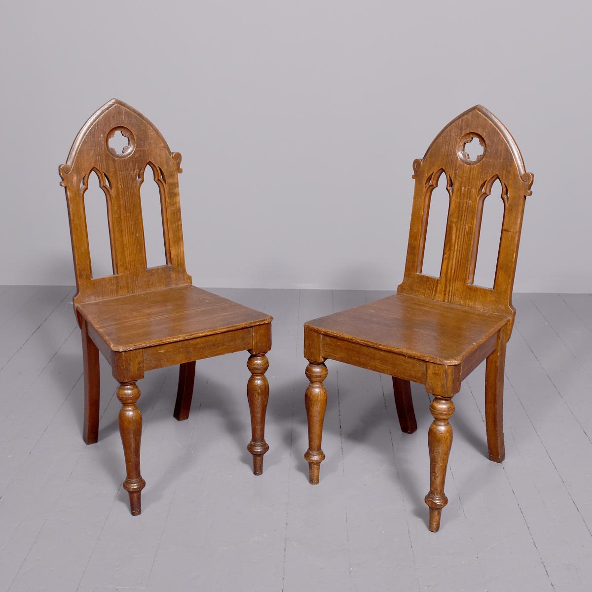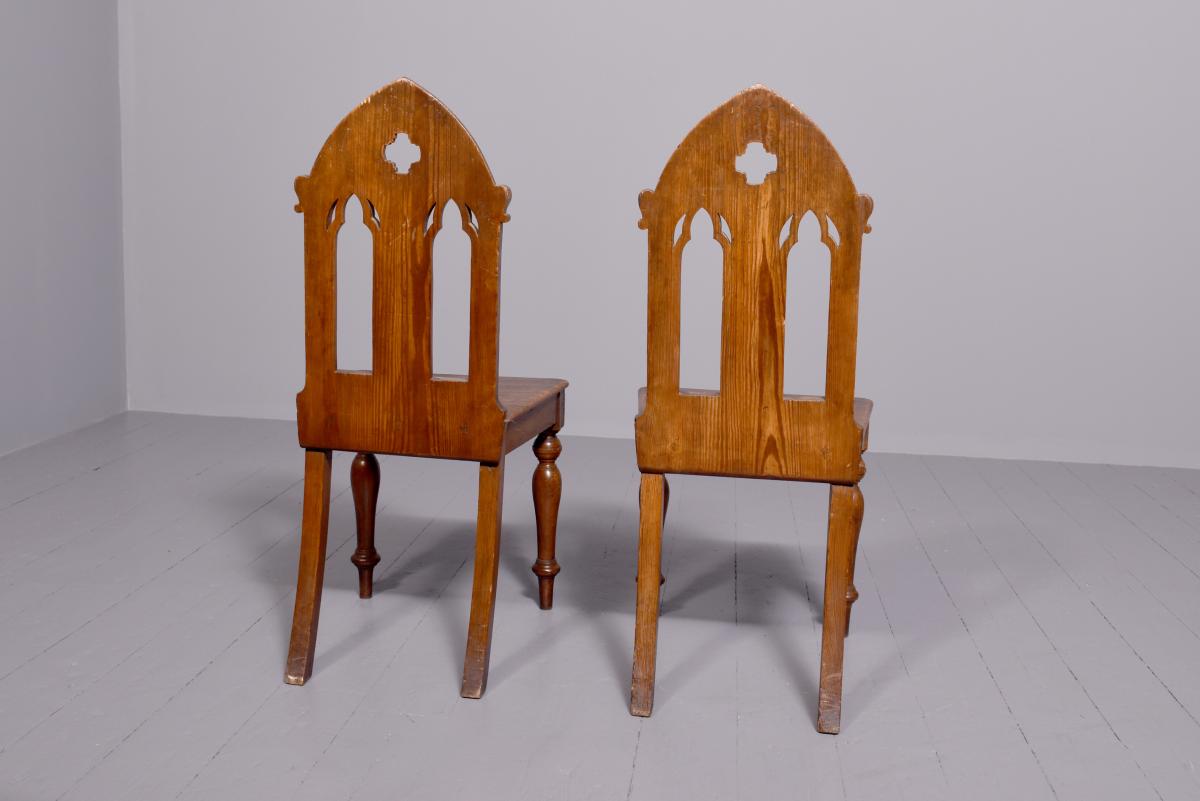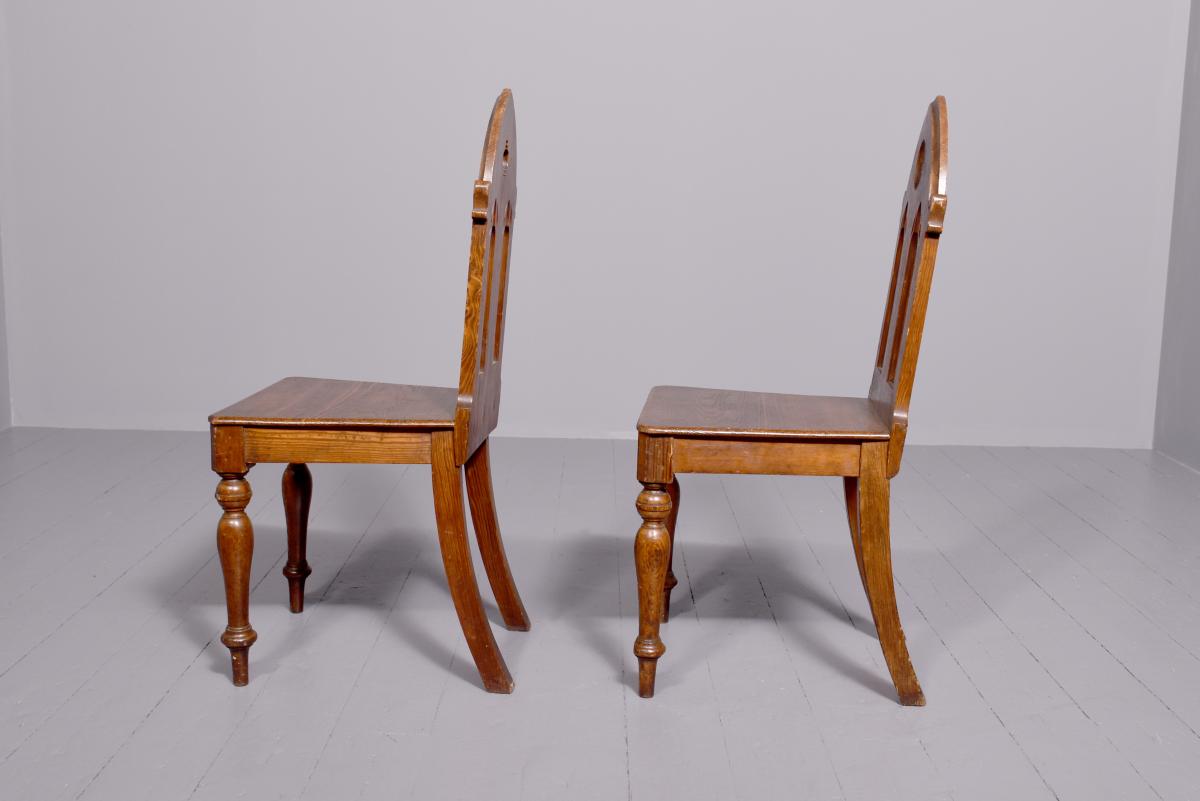 Circa 1850. Rustic pair of quality 19thcentury Gothic pitch pine hall chairs. The arched backs with cut out Gothic-style decorations above the solid seats with chamfered corners above simple seat rails over vasiform front legs and outwept rear supports.