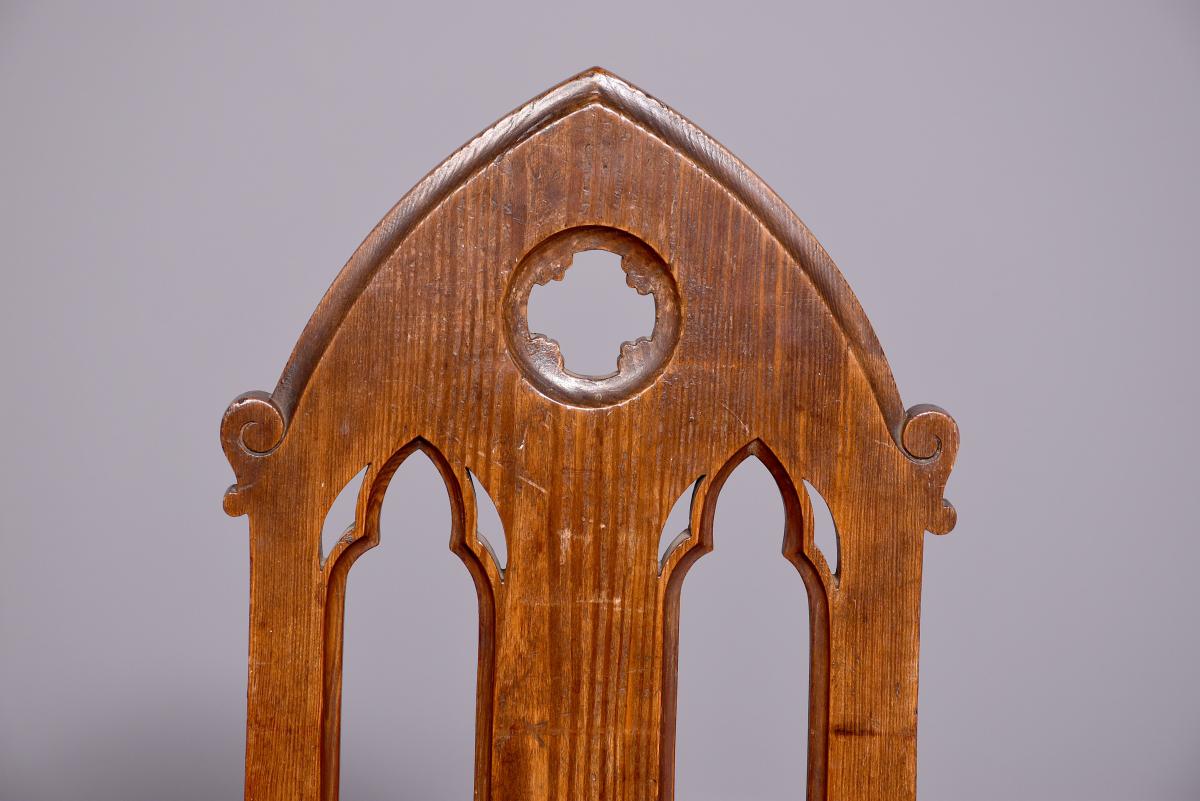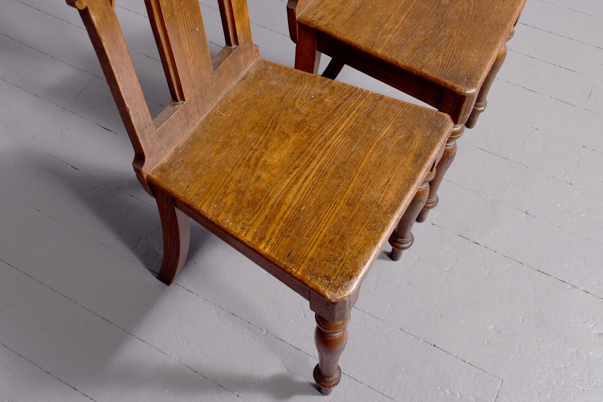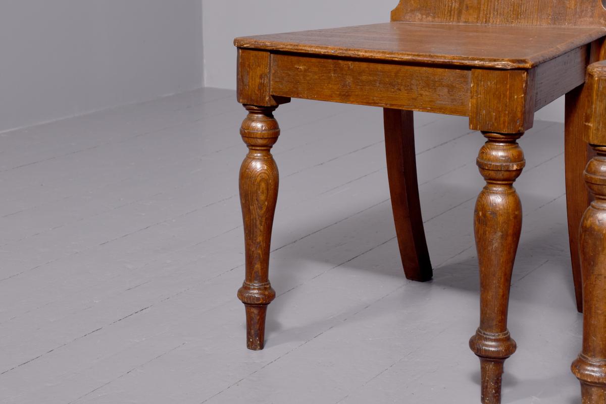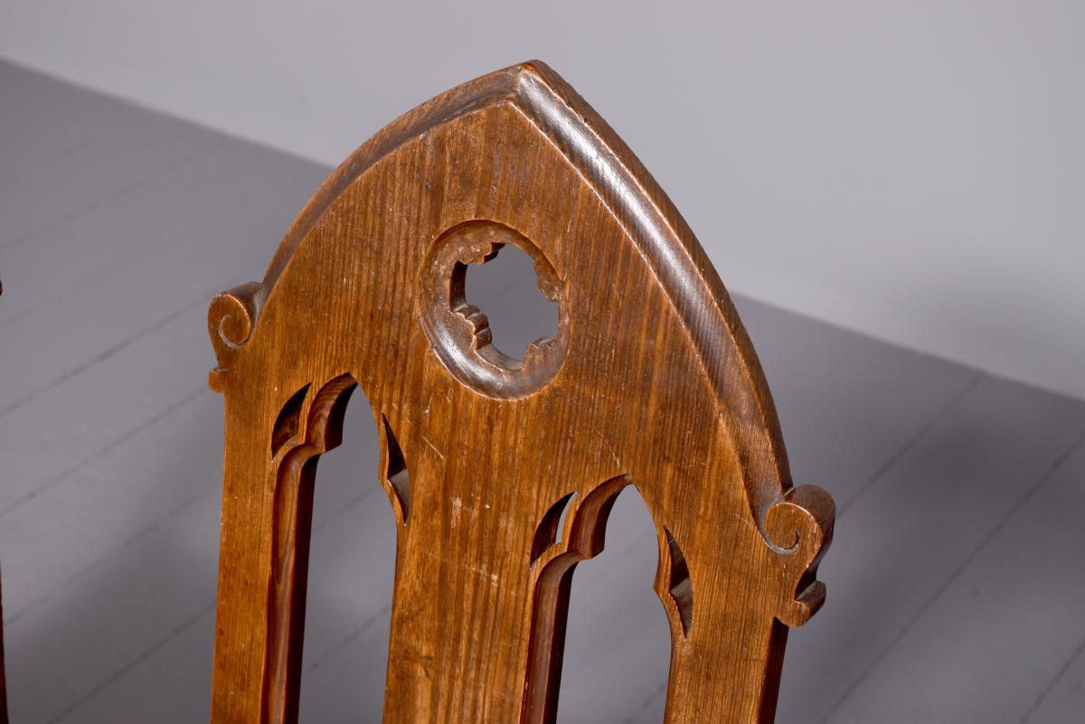 Circa 1850. Rustic pair of quality 19thcentury Gothic pitch pine hall chairs. The arched backs with cut out Gothic-style decorations above the solid seats with chamfered corners above simple seat rails over vasiform front legs and outwept rear supports.