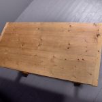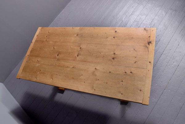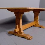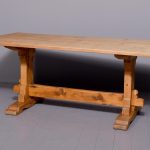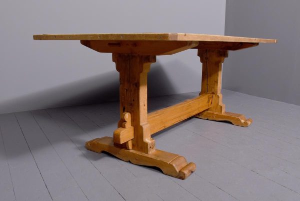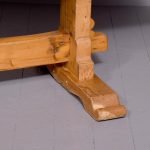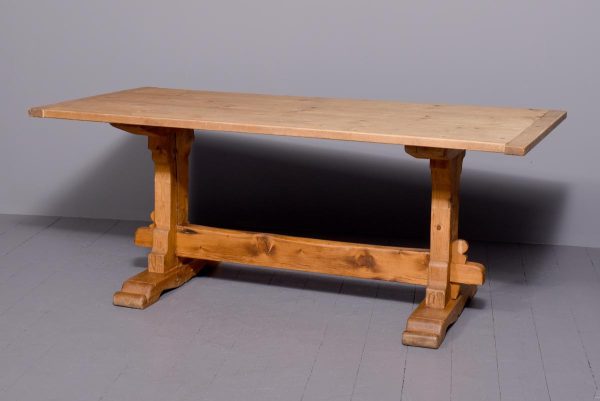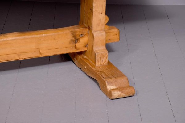 Circa 1970. A Georgian style pine refectory table, the solid top with simple fore-edge resting on a pair of stout trestle ends braced by a large stretcher with visible pegs in the through mortise & tenon joint, with shaped buttresses to the sides resting on a shaped foot.
