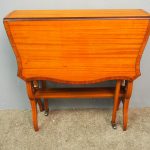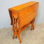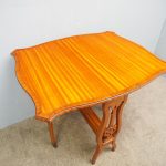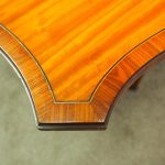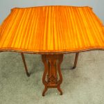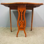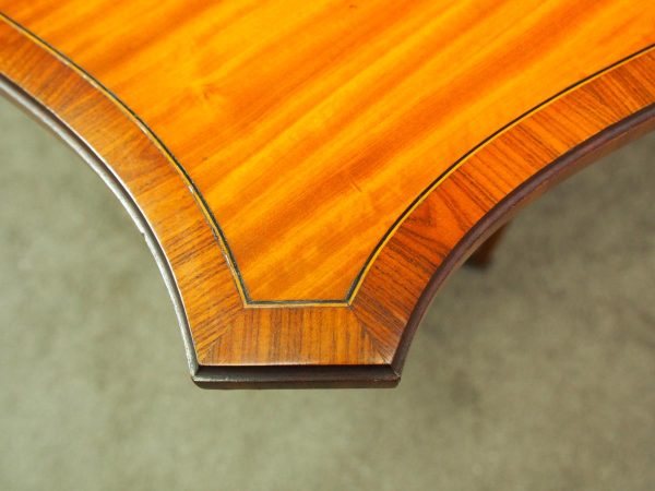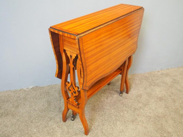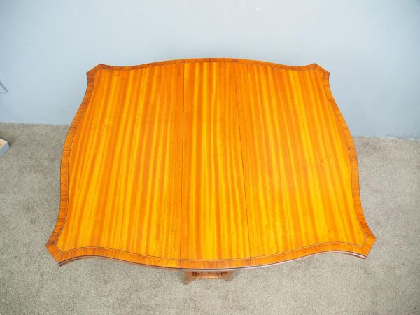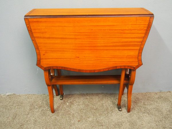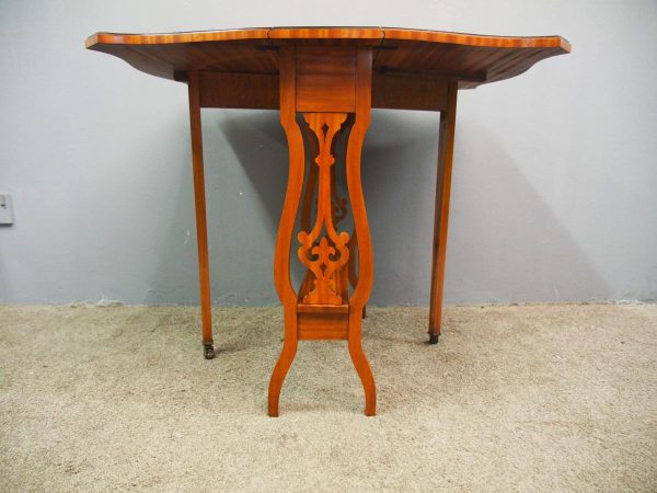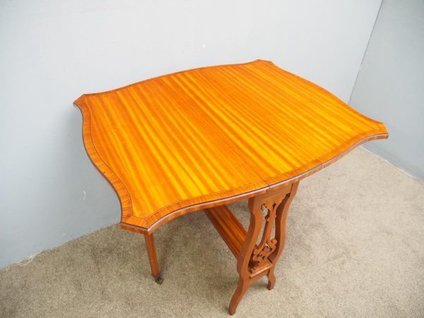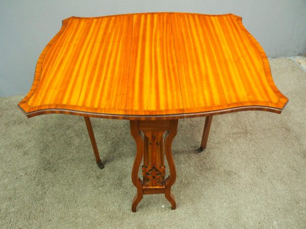 Circa 1890, exhibition quality, inlaid solid satinwood butterfly-shaped Sutherland table. The shaped top with boxwood string and kingwood banding, simple moulded edges and open pierced trestle ends with under-shelf over shaped supports. The folding leaves supported on 2 square, hinged legs, finishing on brass castors.