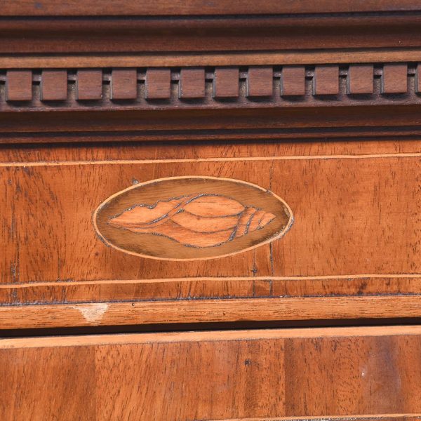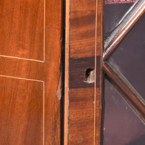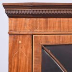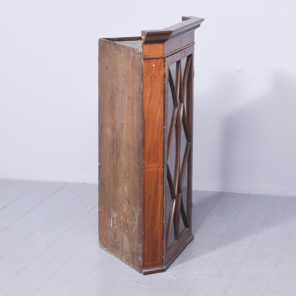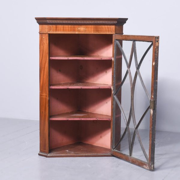 Circa 1780. A good George III Scottish mahogany and inlaid hanging corner cabinet. The moulded top with its dentilled details, stylish frieze with shell and string inlay. The sides with the Gothic arch inlay with a dot above it, a feature that occurs frequently on Edinburgh furniture from the 1750-1800’s Single door to the front with string inlay, boxwood and stylish shaped astragals. The inside of the cabinet has three shelves, beneath the door there is a further moulding.