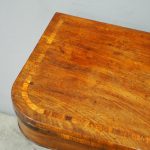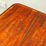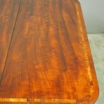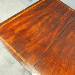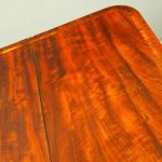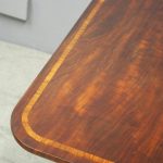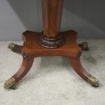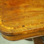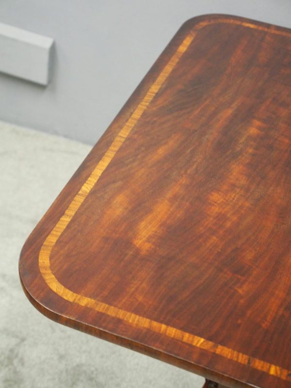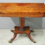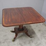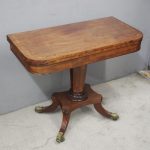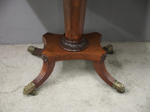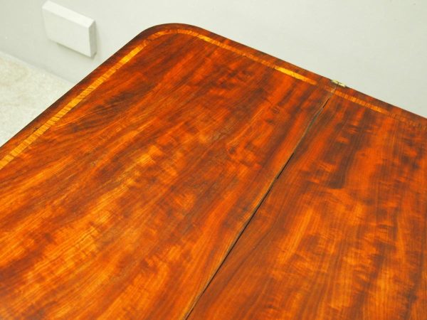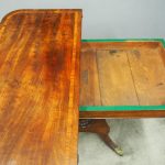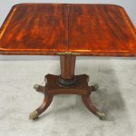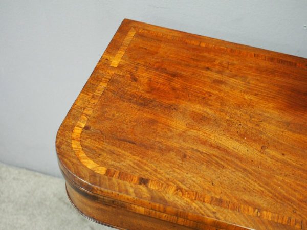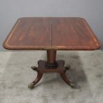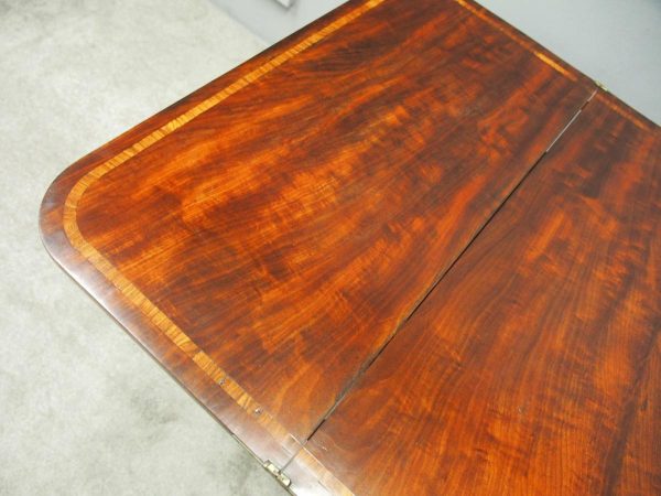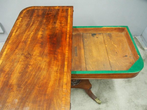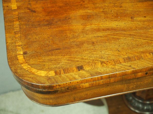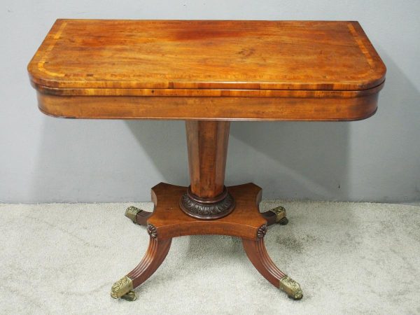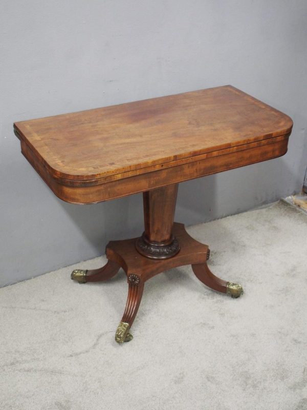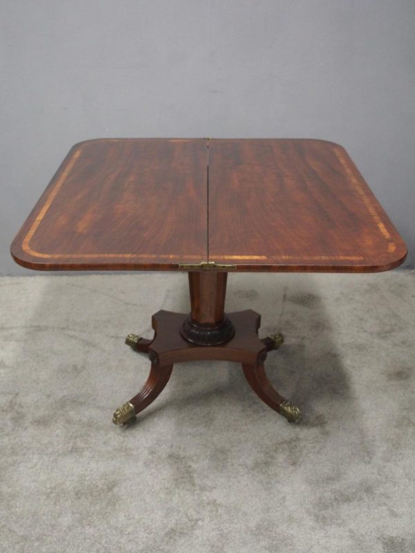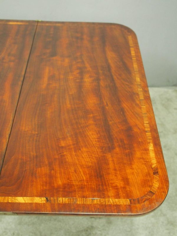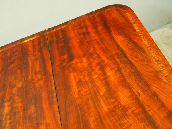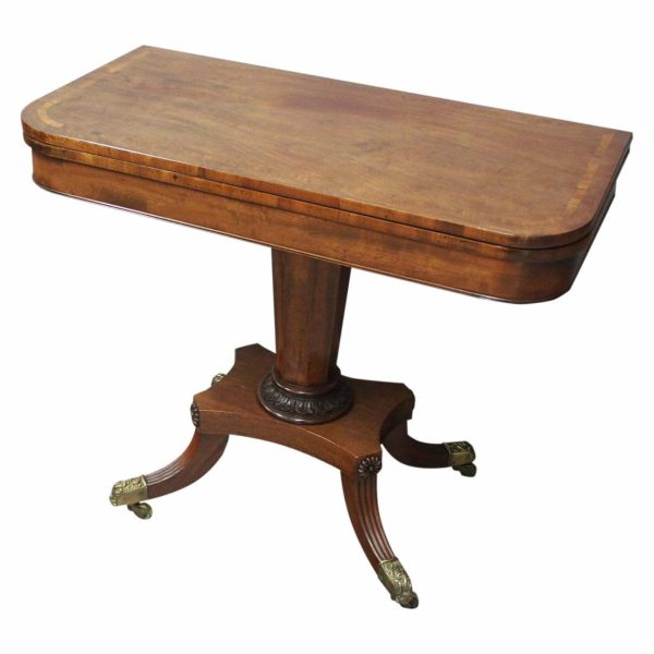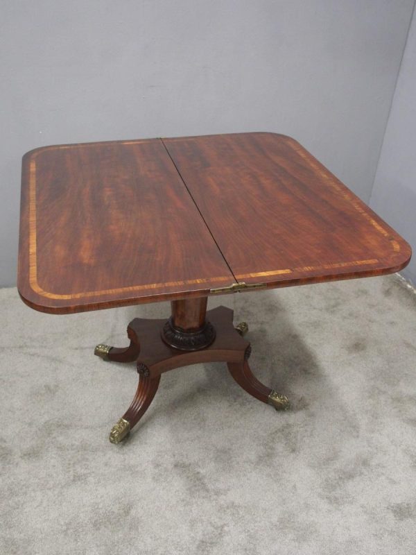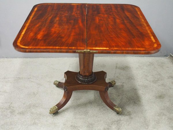 Circa 1850, exhibition quality Scottish George III mahogany fold-over tea table. The rectangular top with rounded corner and rosewood cross-banding (and similar interior) over a beaded frieze. On a tapering, octagonal column with foliate carved collar on a concave platform base. The sabre legs with flowerhead tops and well cast feet with brass castors.