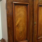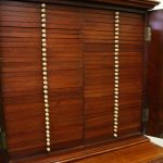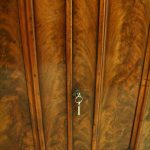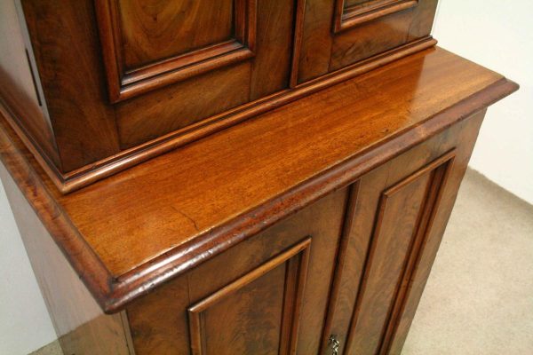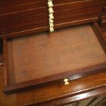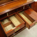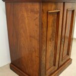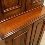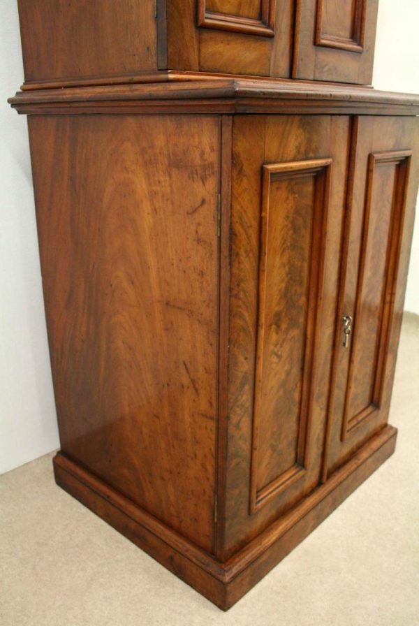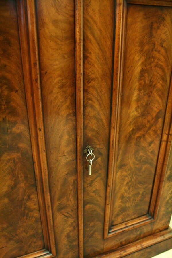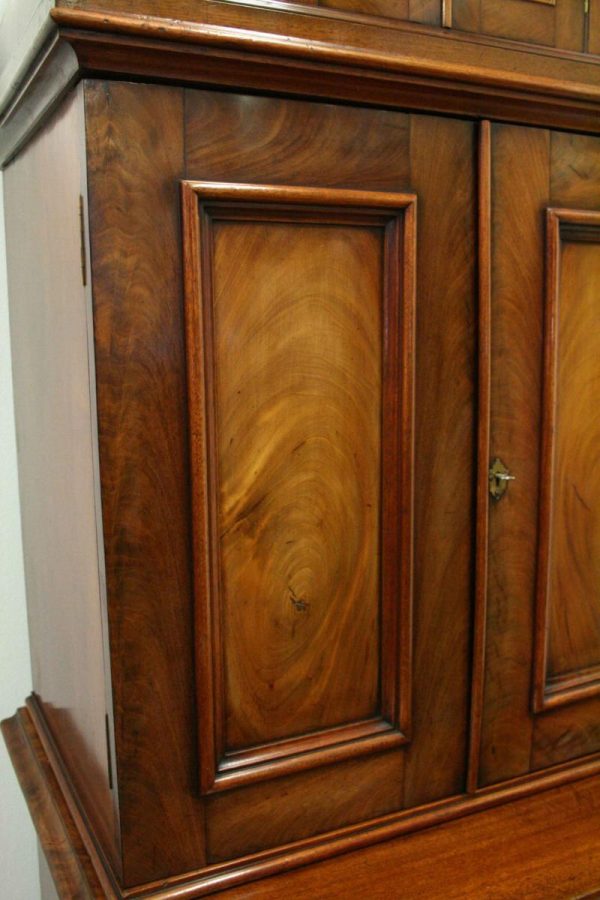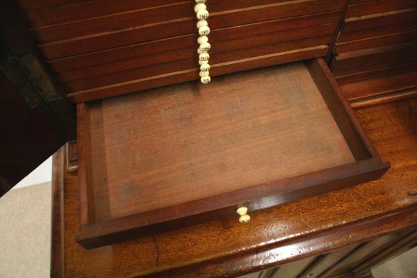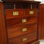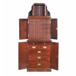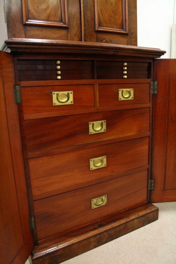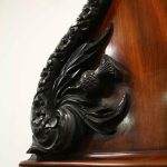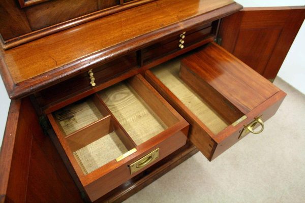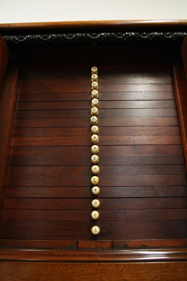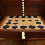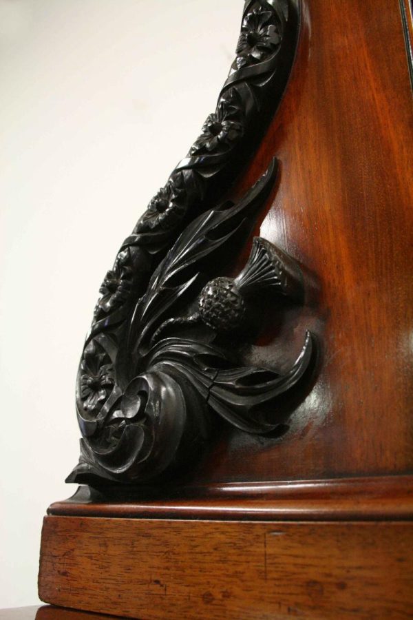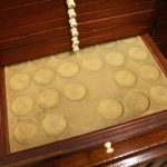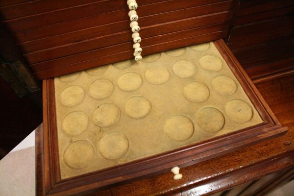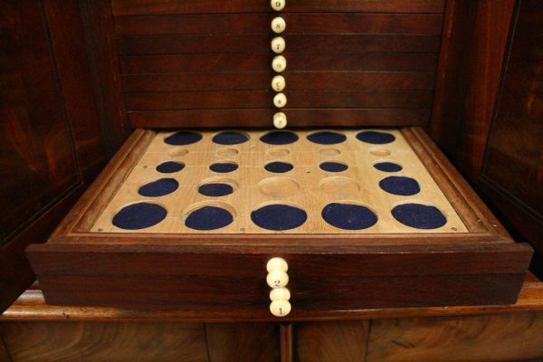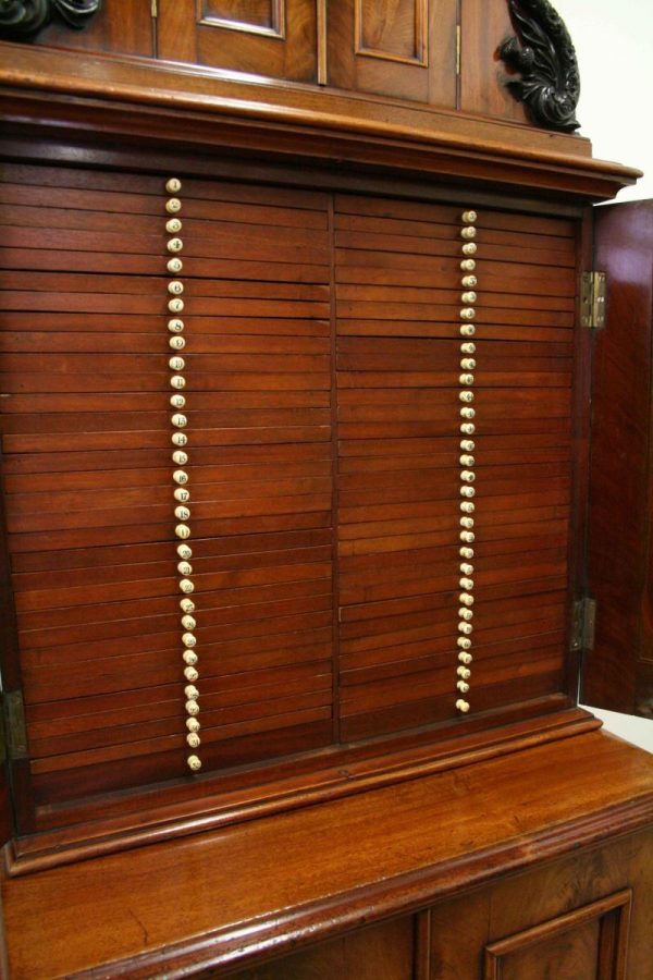 Circa 1870, impressive exhibition quality Scottish mahogany coin cabinet, made in three sections. The pagoda shaped top section with two flame mahogany doors framed by a very stylish ebonised moulding with fine foliate, thistle and ribbon carvings. The doors enclose 18 numbered slides with various shaped apertures for a coin or medallion collection, each with an ivory handle. The middle section encloses an arrangement of 64 pull-out slides again of various sizes with square lined apertures for coins and collections. The base is fitted with pull-out slides to the top, two short drawers, one fitted with a hinged compartment, the other with three compartments, and three long drawers below, all with military style flush brass handles and ash liners. All standing on a plinth base.