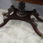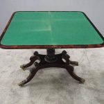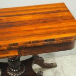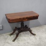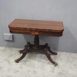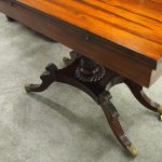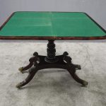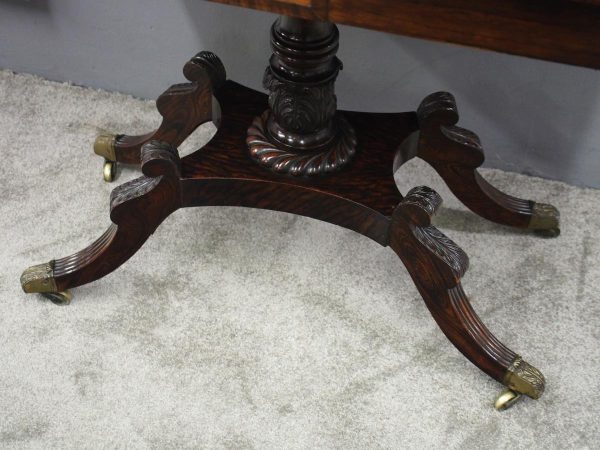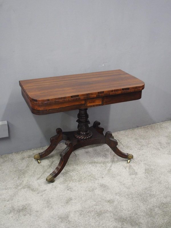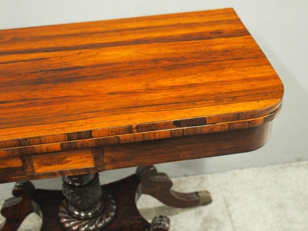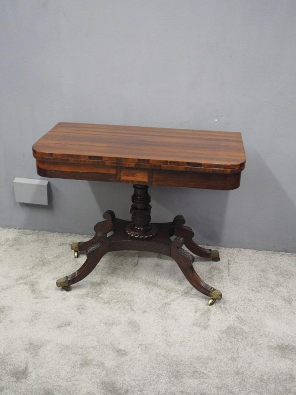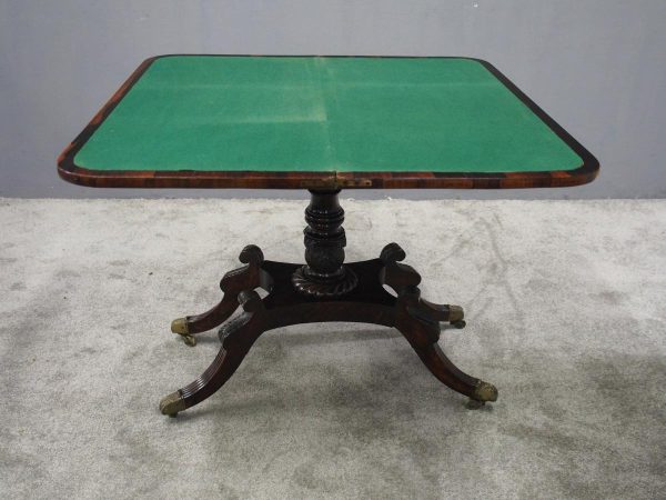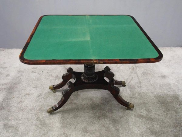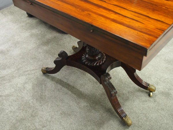 Circa 1815, Scottish Regency rosewood fold-over card table. The well figured rosewood top with rounded edges, opening to a green baize lining and swivelling to a compartment for storage. The rosewood panel frieze over a turned, ring turned and carved acanthus leaf stem with a dragooned collar, on a raised concave rosewood and scumbled platform base. The hipped sabre legs with foliate carved tops, reeded base and well cast brass foot and castors.