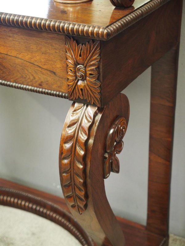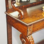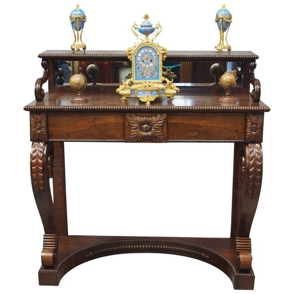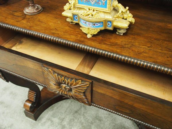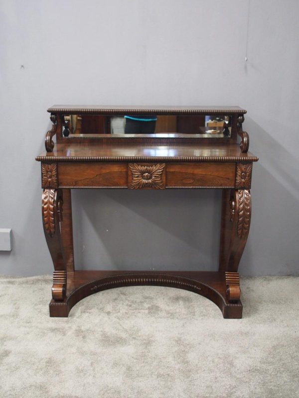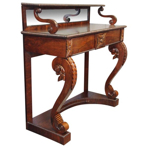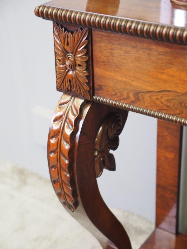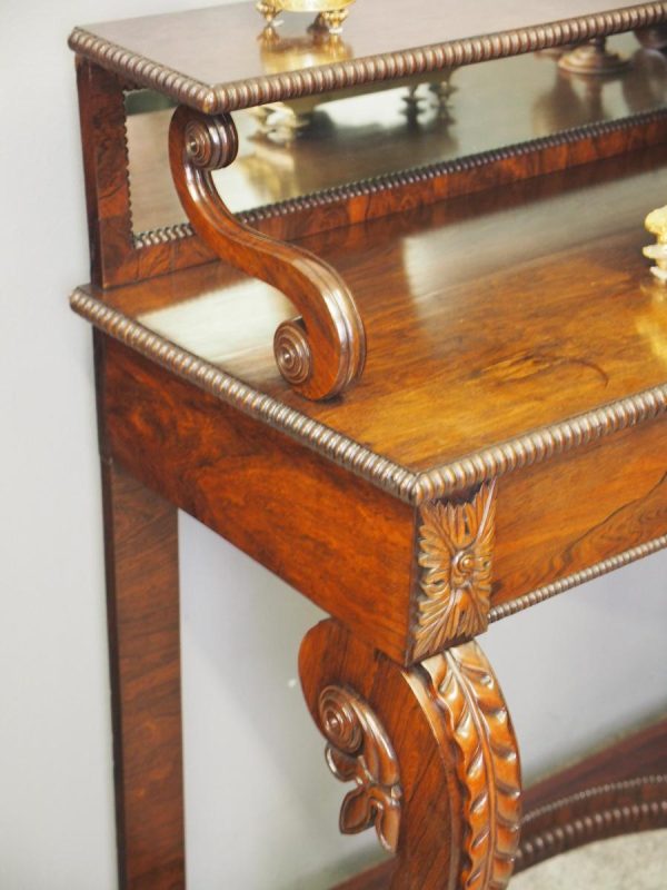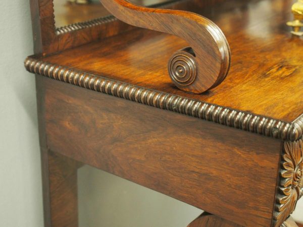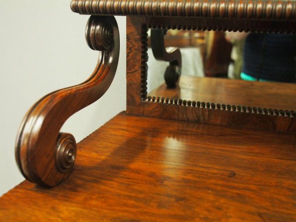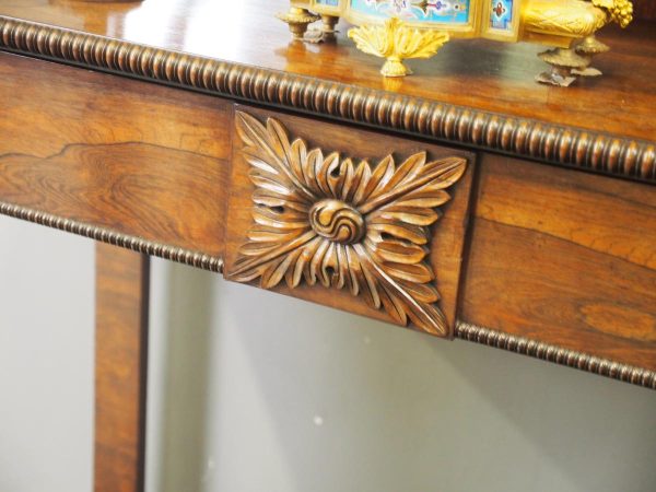 Circa 1820, exhibition quality, Scottish Regency rosewood ledge-back chiffonier. With well figured rosewood top and tier, and beaded edges; the top tier is held in place by scrolling arms with a mirror back section back framed with further beading. The full length drawer with a central, large carved flower and flower heads either side, standing on two large scrolling legs with acanthus leaves to knees, foliate carving to sides, and ribbed section above a curled toe. The back legs are rectangular, finished in rosewood and on a concave, enclosed plinth with an unusual, patterned, tapered beading.