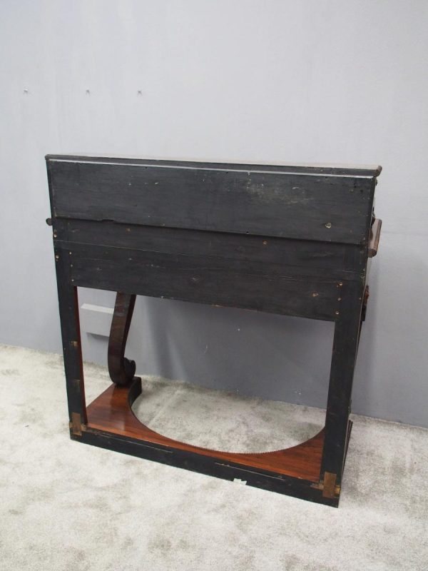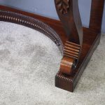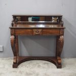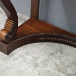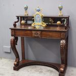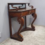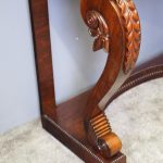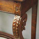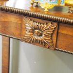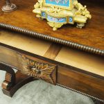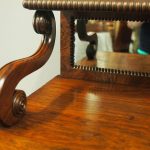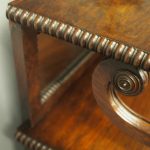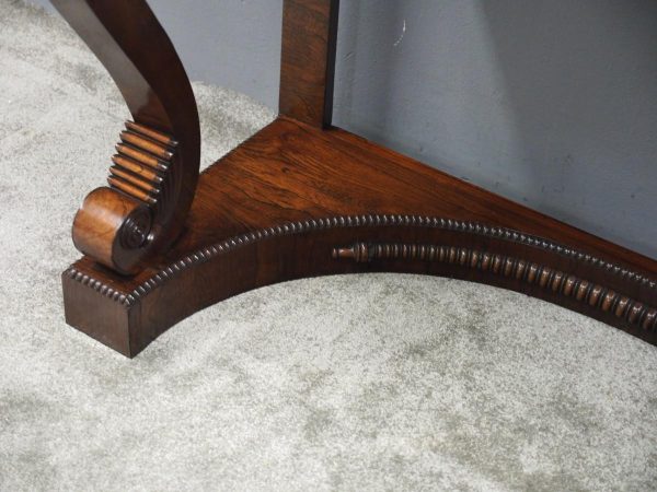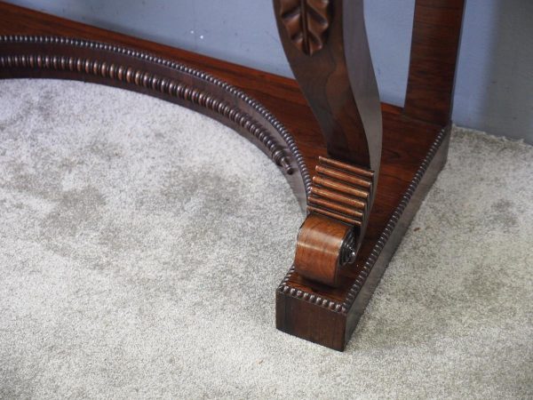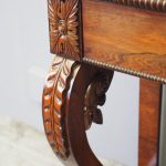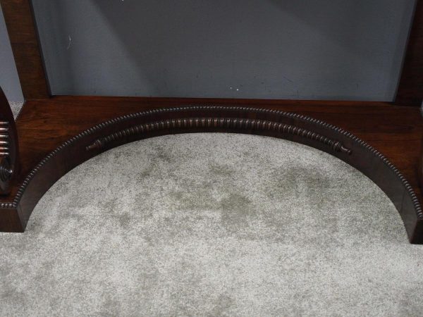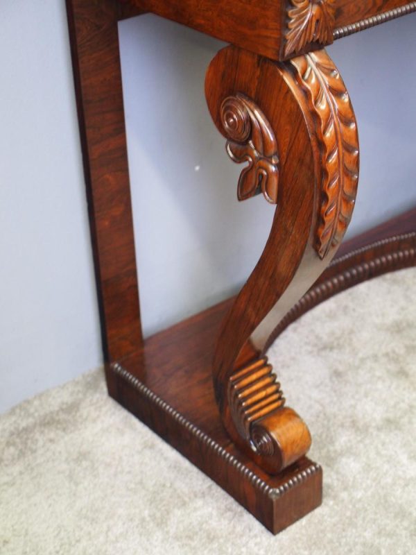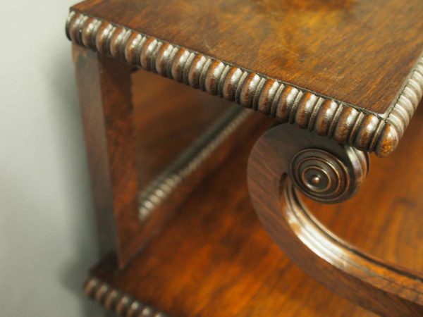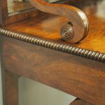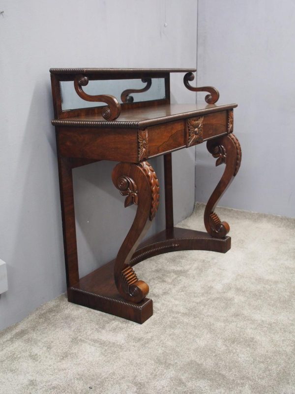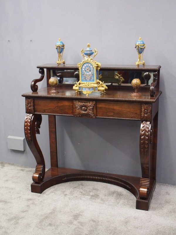 Circa 1820, exhibition quality, Scottish Regency rosewood ledge-back chiffonier. With well figured rosewood top and tier, and beaded edges; the top tier is held in place by scrolling arms with a mirror back section back framed with further beading. The full length drawer with a central, large carved flower and flower heads either side, standing on two large scrolling legs with acanthus leaves to knees, foliate carving to sides, and ribbed section above a curled toe. The back legs are rectangular, finished in rosewood and on a concave, enclosed plinth with an unusual, patterned, tapered beading.