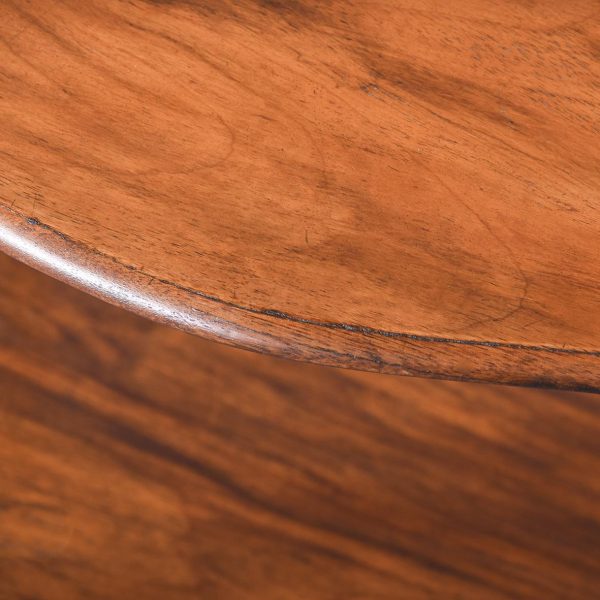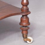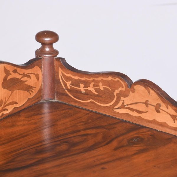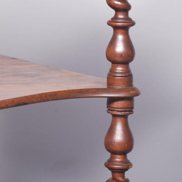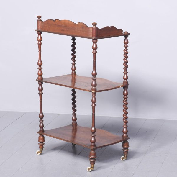 Circa 1870. Mid Victorian figured walnut serpentine fronted 3 tier whatnot. The top with a shaped and inlaid ¾ gallery with foliate and bird inlay, the uprights surmounted by turned finials. The three serpentine shelves supported at the back by turned and ring turned supports, to the front turned and barley sugar columns, resting on four turned feet, finishing on a brass cup with white porcelain castors beneath.