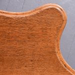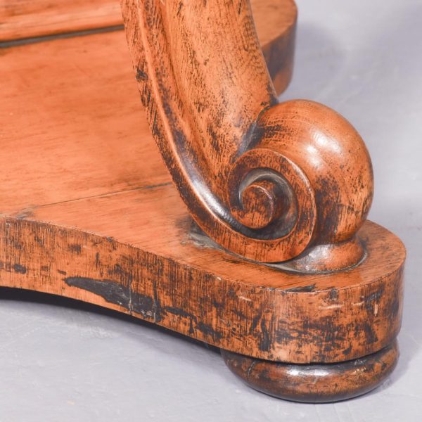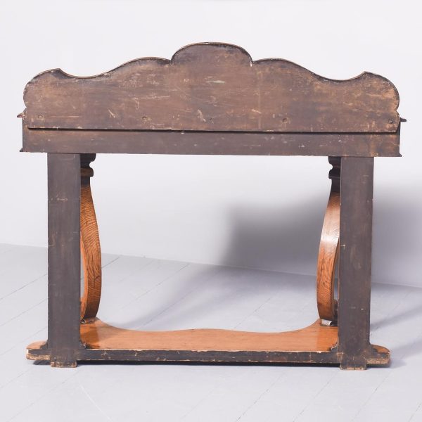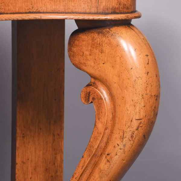 Circa 1870. A mid-Victorian oak country house hall table of desirable proportions. The raised and shaped back with a heraldic shield in the centre, the serpentine shaped top with a moulded fore-edge, the deep frieze with a drawer concealed in the centre, supported on a pair of elegant cabriole legs to the front, rectangular legs on the back and all resting on a platform base which follows the form of the top, with squat bun feet beneath. Great colour and patination.
