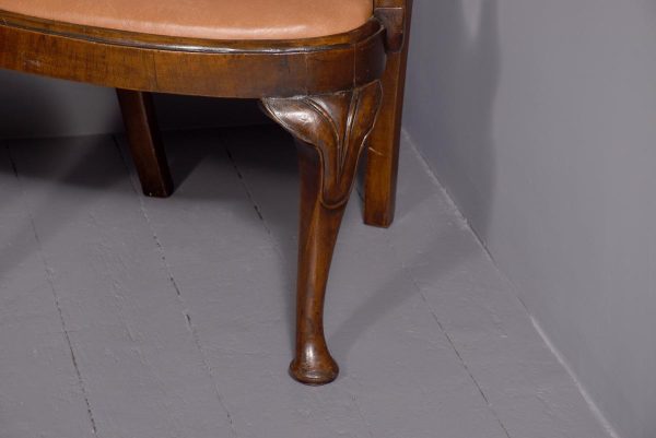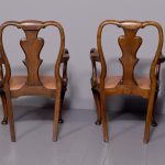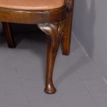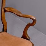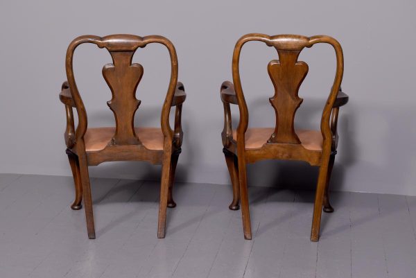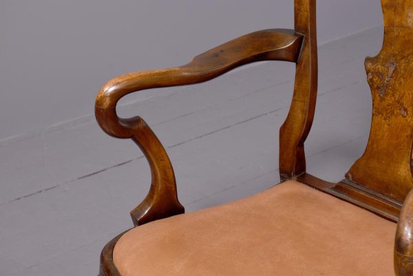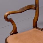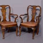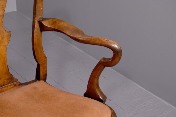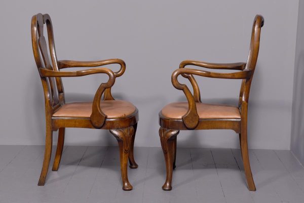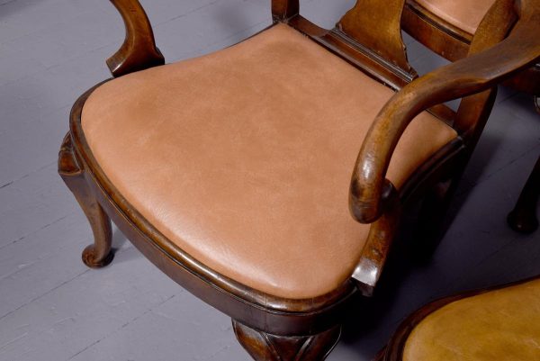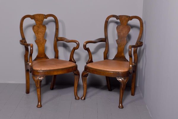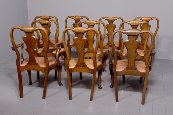 Circa 1880. A set of 10 walnut George II dining chairs, the shaped top rail with an elegant splat in burr walnut, the two armchairs with shaped arms with shepherd crook style at the front, each with a drop in seat pad the seat-rail with moulded fore-edge and simple frieze, the back legs are square and slightly out swept the elegant lappet front legs with quarter blocks with carving finishing on a padfoot.