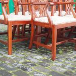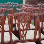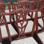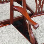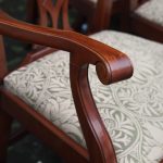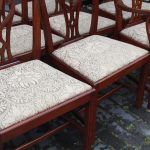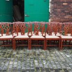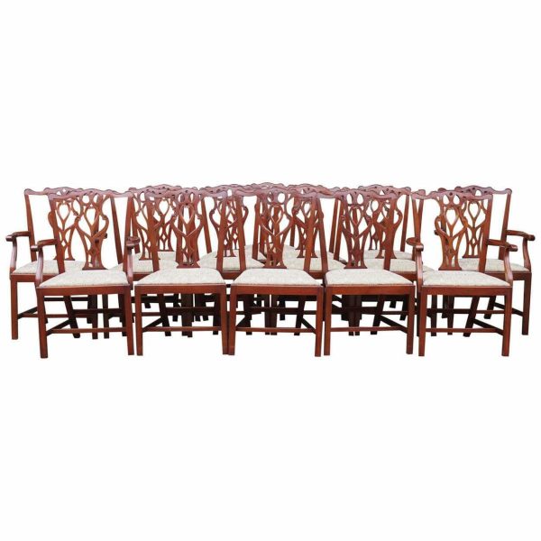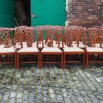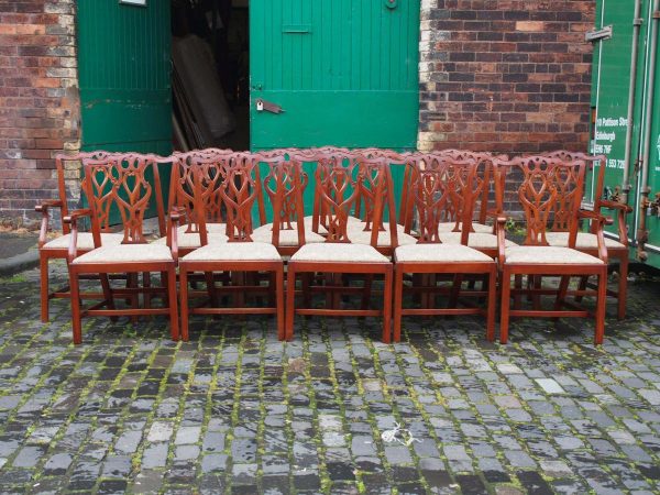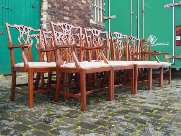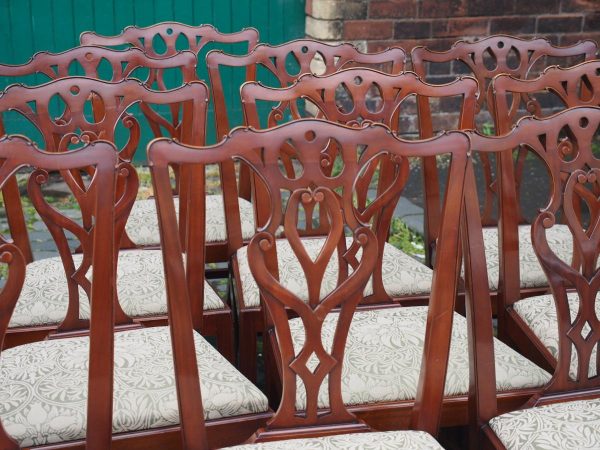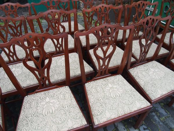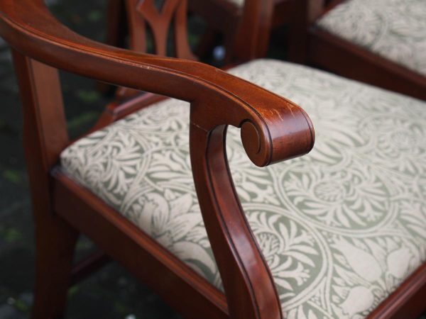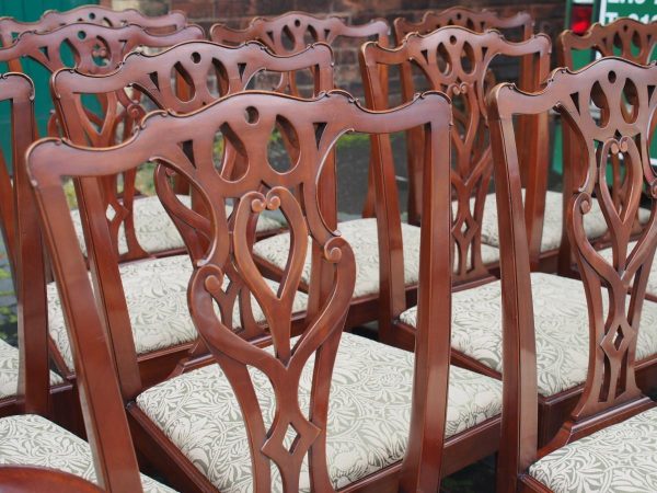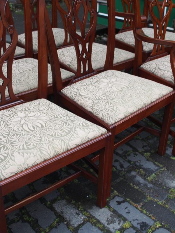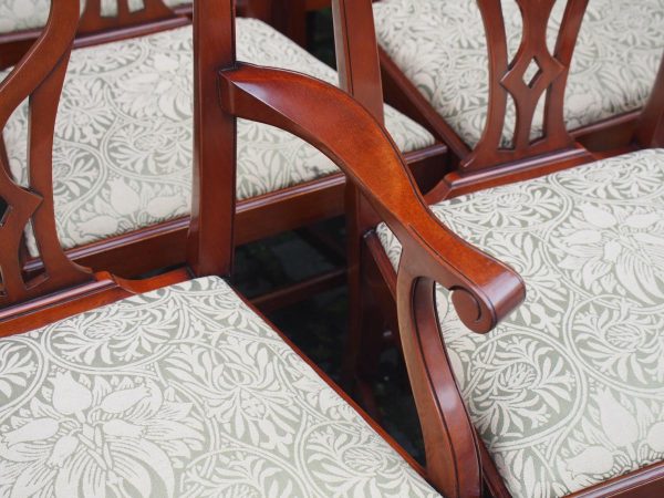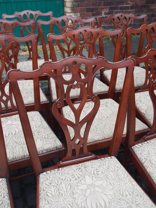 Circa 1990, set of 16 George III style mahogany dining chairs. Consisting of 4 armchairs with 12 side chairs, and shaped, carved top rail and pierced back, and arms on stylish uprights. With drop in seats in William Morris style fabric, on a simple seat rail with slightly outswept back legs and chamfered, reeded front legs and conforming H stretchers, with a further stretcher to the back.