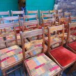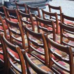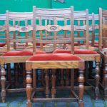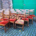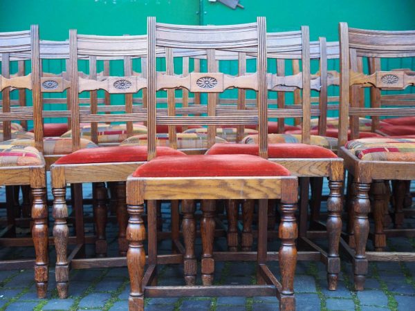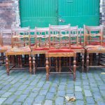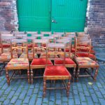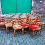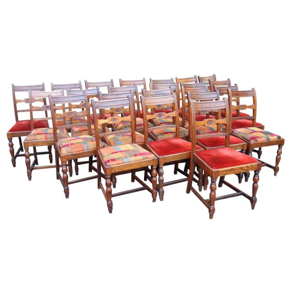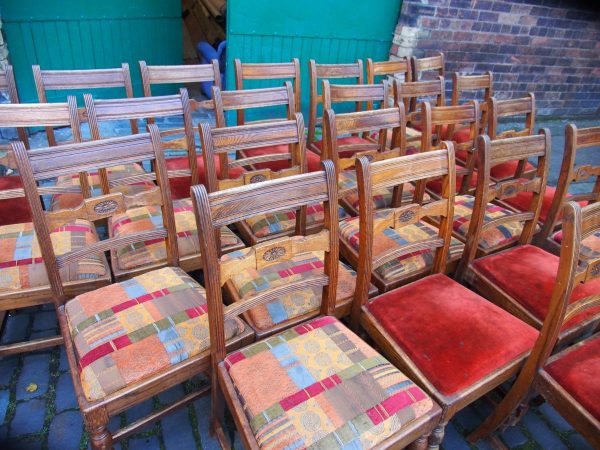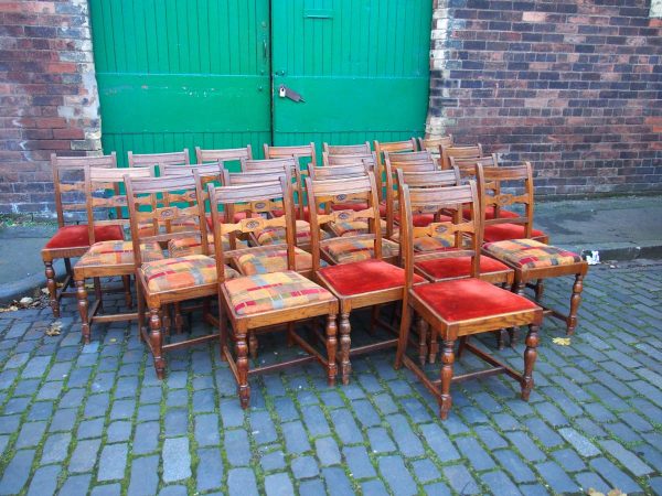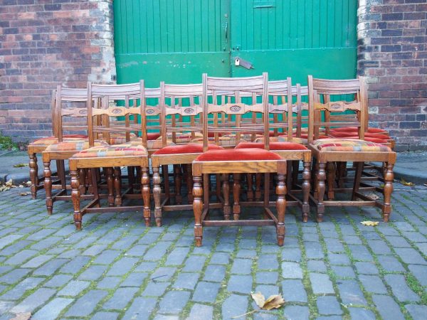 Circa 1890, rare set of 23 solid oak dining chairs. Recently stained, waxed, polished and re-framed, the chairs have reeded, rounded uprights and a curved and reeded top rail. The central splat has an oval carved paterae in the centre and ribbed section beneath. The drop in seats lead on to slightly outswept back legs and the front legs are turned and ring turned, tapering down to a block and raised, turned toe. The legs are united by H frame stretchers.