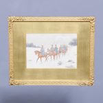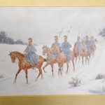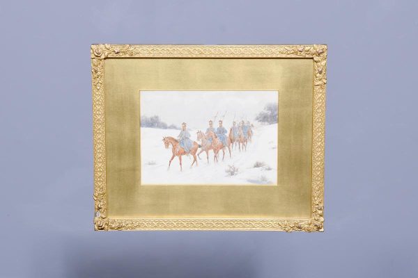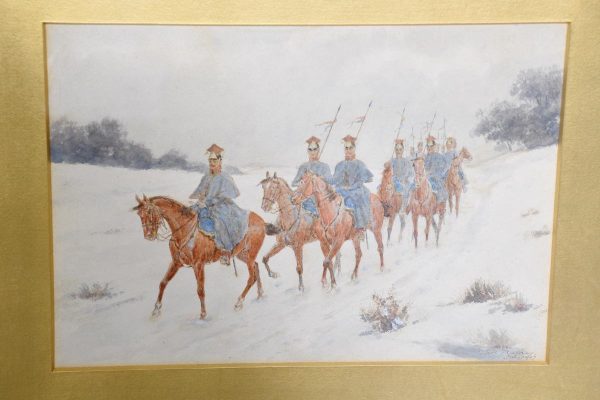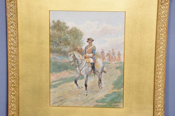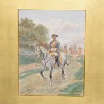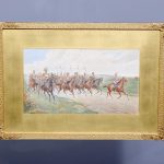 A set of three watercolours, all signed by ‘Thomas Mackay, July 1907’. The subject matter includes cavalry and various mounted soldiers, all in glazed and gilded frames with a large gold slip in a well carved and gilded frame, verso on all frames has a trade label for ‘Mauwson and Morgan of Newcastle upon Tyne.’ The watercolours are in excellent condition.
