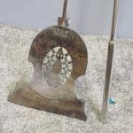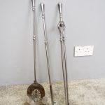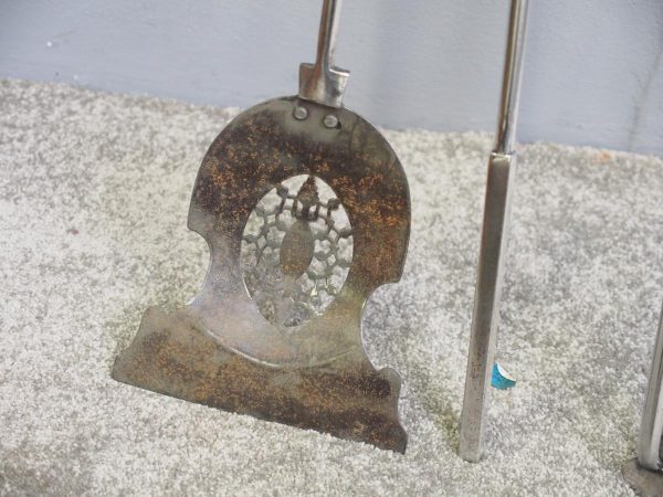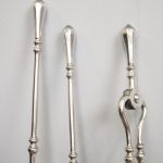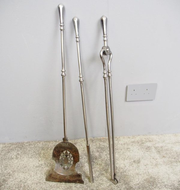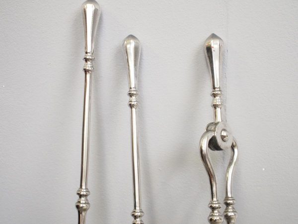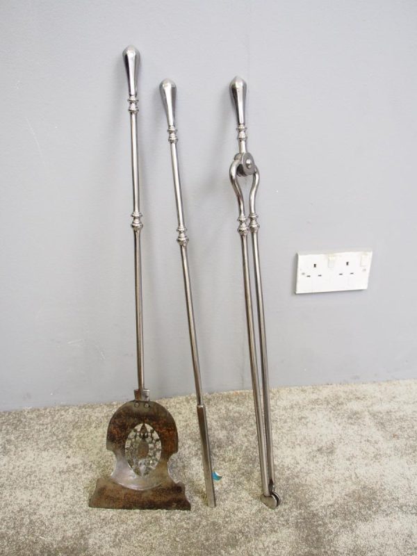 Circa 1820, set of 3 George III polished steel fire tools, consisting of tongs, poker and shovel. Each has a bulbous, faceted cap and have ring turning to the sections, and the shovel has a fretwork pattern.