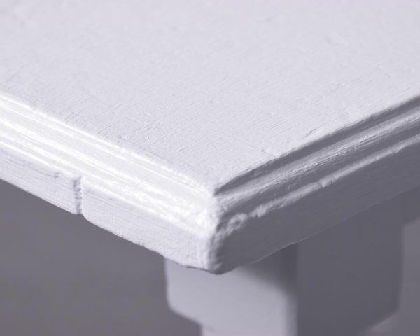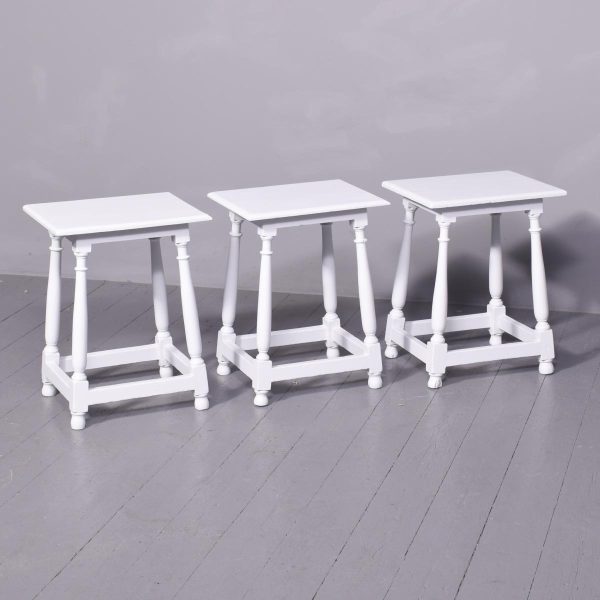 Circa 1880. A stylish set of three painted late Victorian occasional tables, each with a rectangular top with finely molded fore-edge and simple frieze, all resting on four turned splayed legs braced by conforming stretchers and finishing on round foot, recently painted.