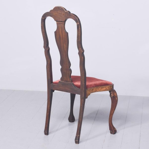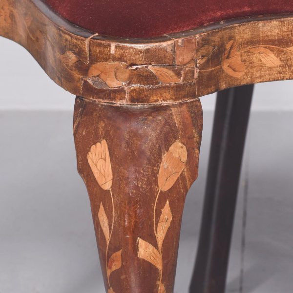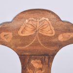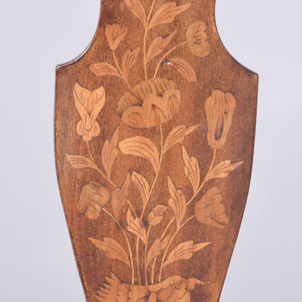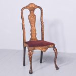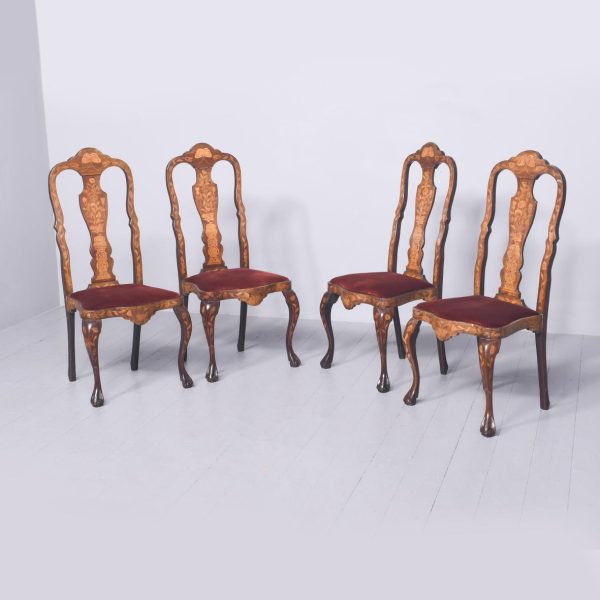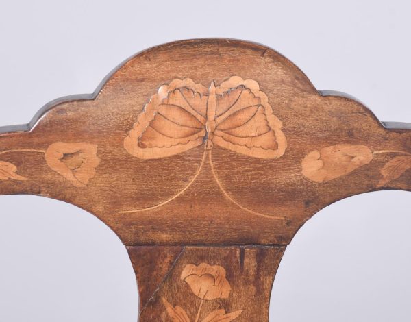 Circa 1820. Quality set of four high back walnut Dutch marquetry chairs, with a shaped cresting rail with a large butterfly inlay on the back, the shaped and inlaid splat smothered in marquetry, the shaped uprights with marquetry on the facing, with drop in serpentine seat, a shaped frieze and side rail all smothered in marquetry. The back legs are turned and slightly out swept, the elegant cabriole legs at the front with marquetry on the facings finishing on a ball and claw foot.