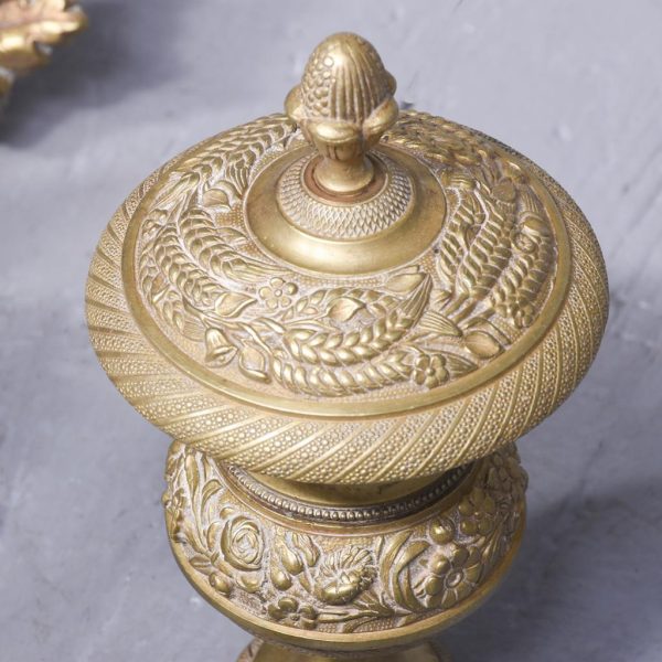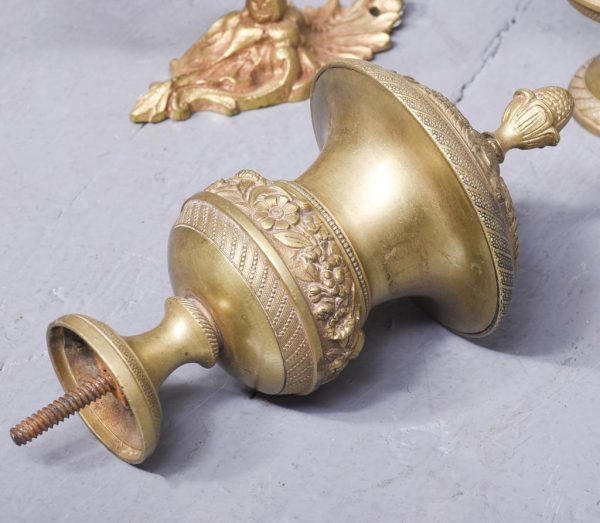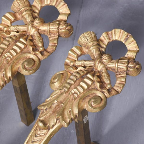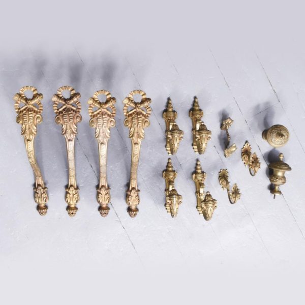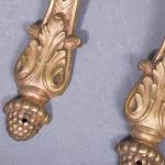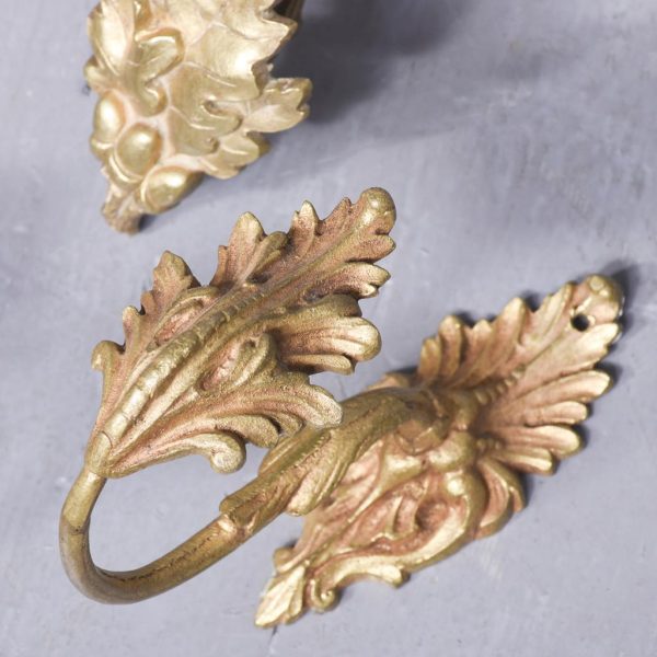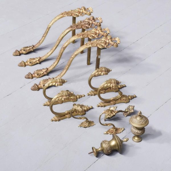 Circa 1860. An unusual and stylish set of four brass and gilded French tie backs. The tops with a folded pierced ribbon and a quiver and a flaming torch in X formation, a shaped arm with Rococo casting style on the top and on the base finishing with a downward facing pineapple. There are also four smaller cast and gilded brass hooks for hanging the curtains on plus some other associated pieces.