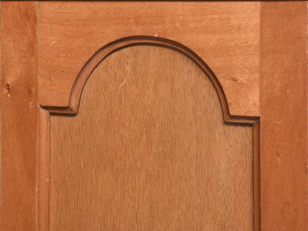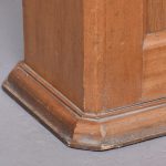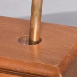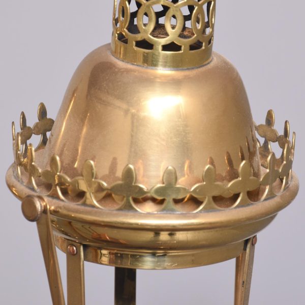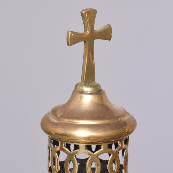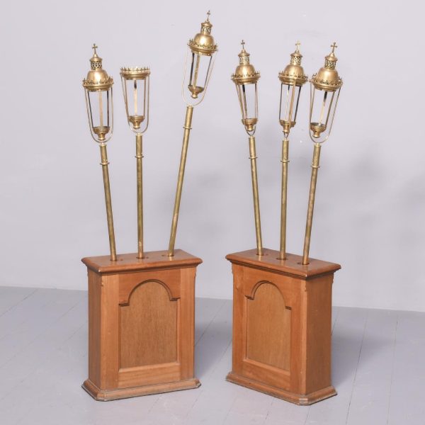 Circa 1900 A set of six brass processional candle holders, five of the holders are complete with pierced caps surmounted by a crucifix, the stands with a turn brass column with a small arch at the top each holder forming a gimble which allows the top section to swing freely. Also included is a pair of mahogany stands each with three apertures, arched on the front and back with canted corners resting on an enclosed plinth, the stands are free standing.