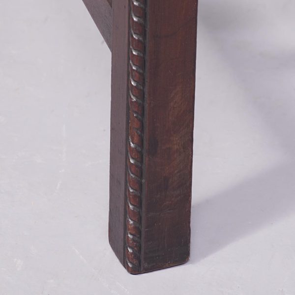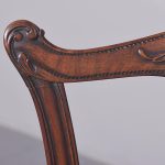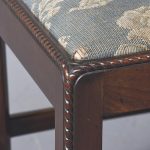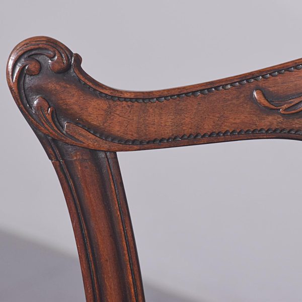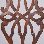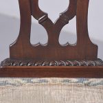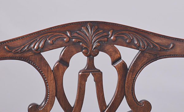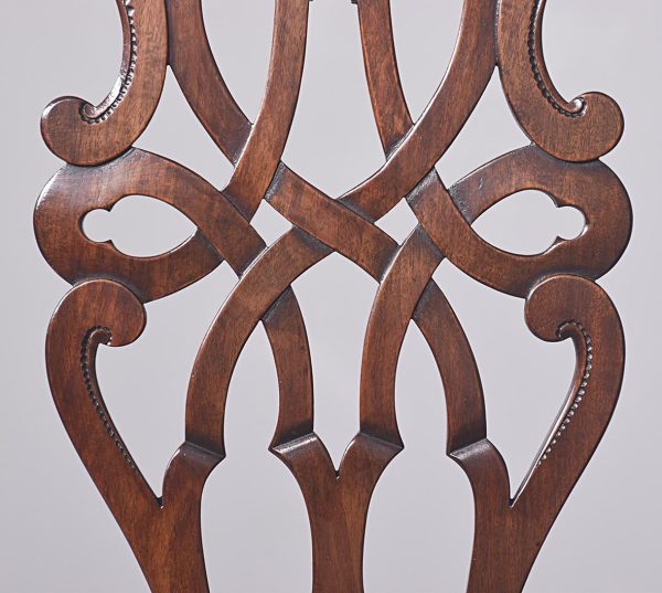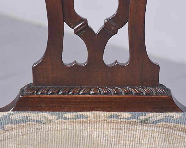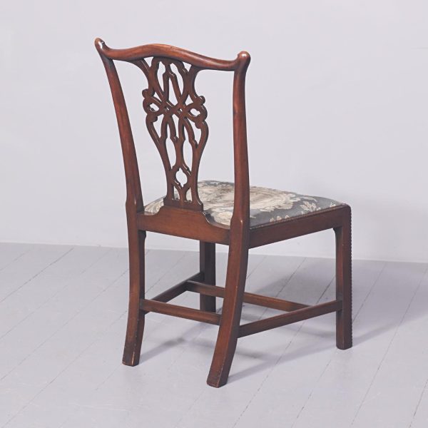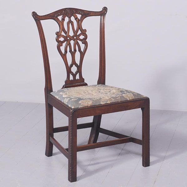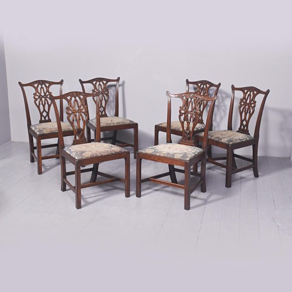 Circa 1800. Set of 6 Chippendale style Georgian mahogany dining chairs with wonderful original colour and patina. The acanthus carved arched top rail above a fretted central splat flanked by fluted supports with scrolling tops. The lift out seats with tapestry upholstery above the reeded seat rail and front legs with H stretchers and outswept rear supports with stretcher. All in excellent condition.