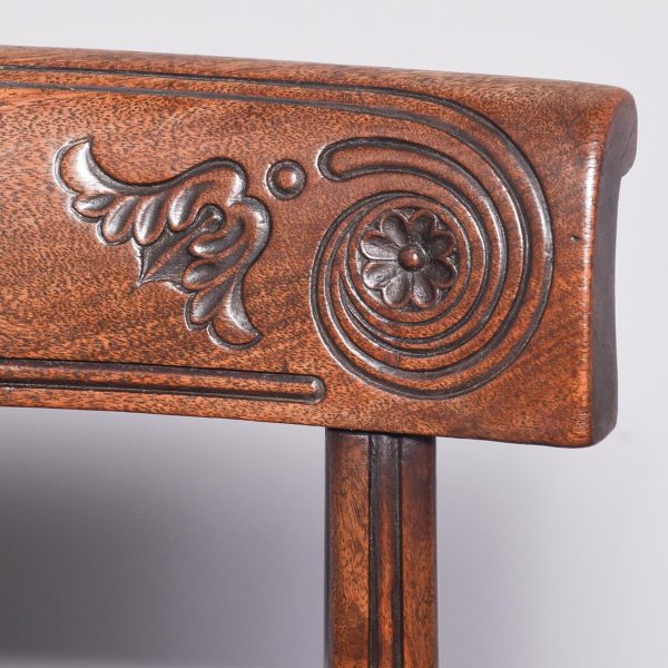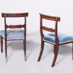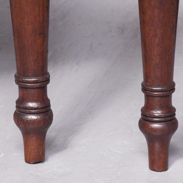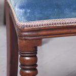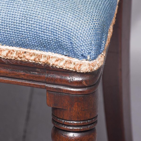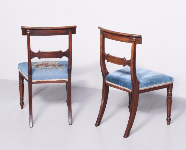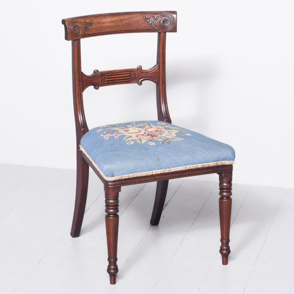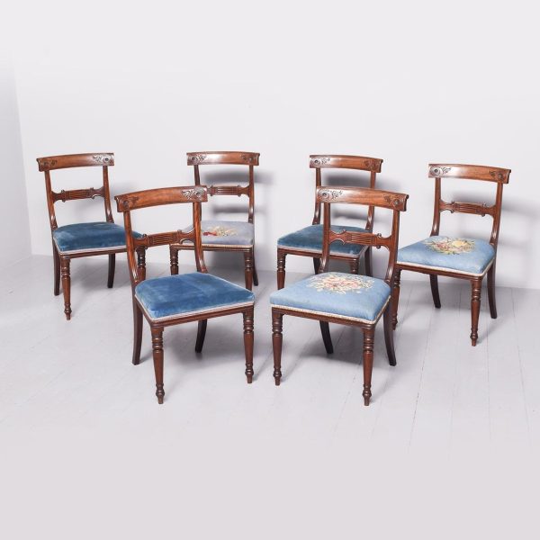 Circa 1820. A quality set of 6 mahogany George IV dining chairs. The curved, shaped and carved top rail supported on reeded uprights with a stylish carved back, with velvet and needlepoint stuffover upholstered seats, shaped simple seat rail, back legs slightly out swept and classic George IV turned and tapering legs to the front.