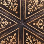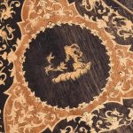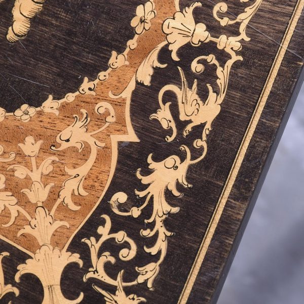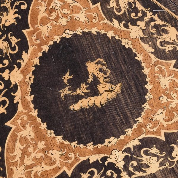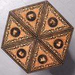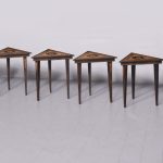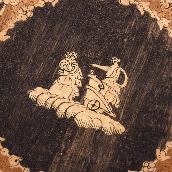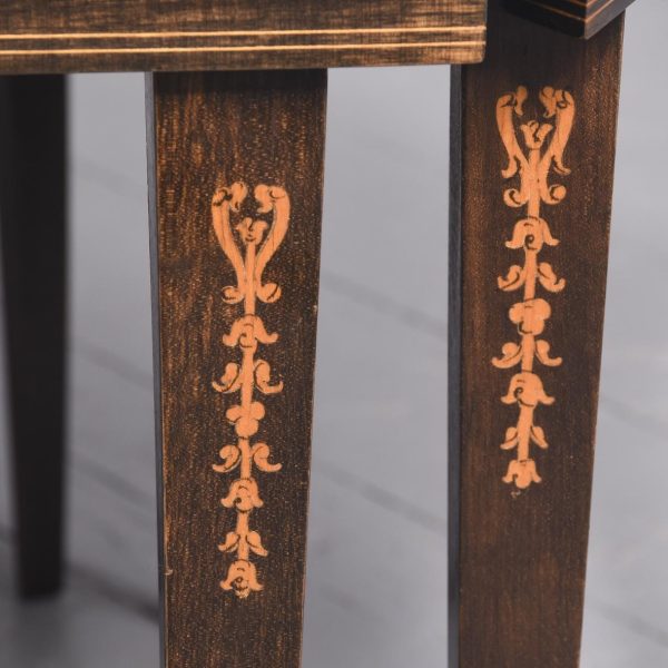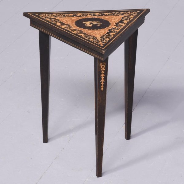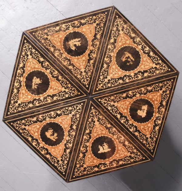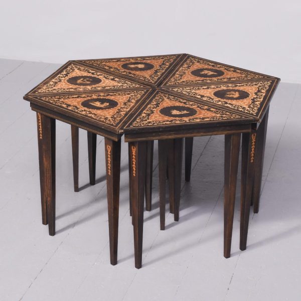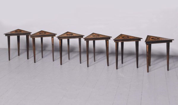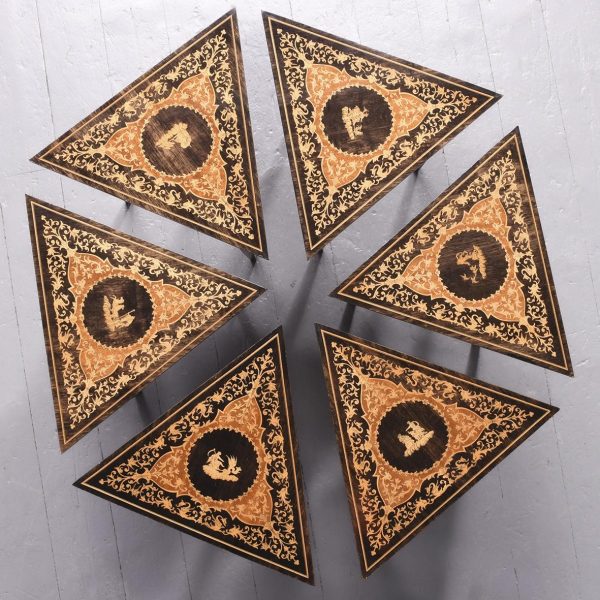 Circa 1970, a rare and unusual set of 6 triangular shaped inlaid occasional tables from Sorrento in Italy, the marquetry tops with a center panel depicting various classical figures in chariots with birds resting on clouds, simple inlaid frieze, resting on 3 square tapering legs with inlay on the facing the tables also form a larger hexagonal table.