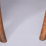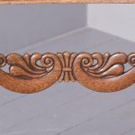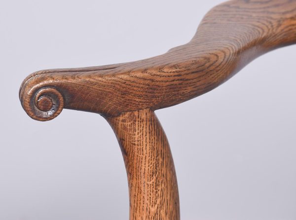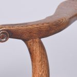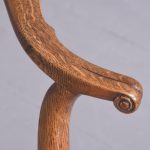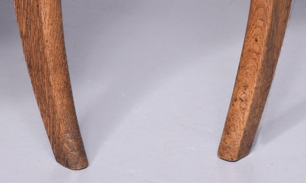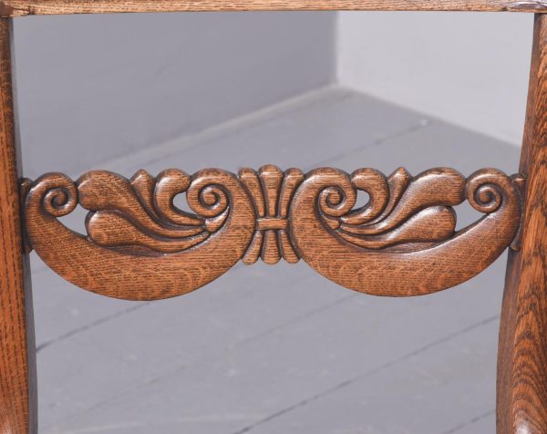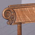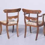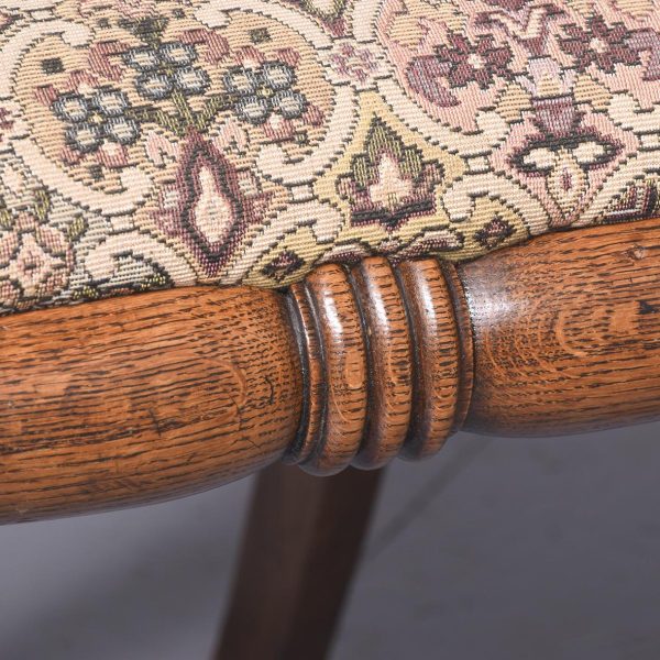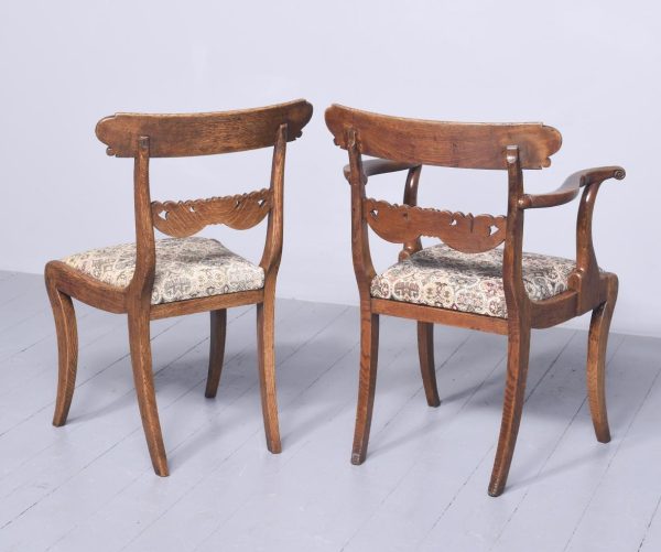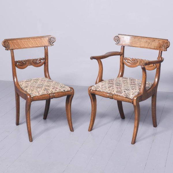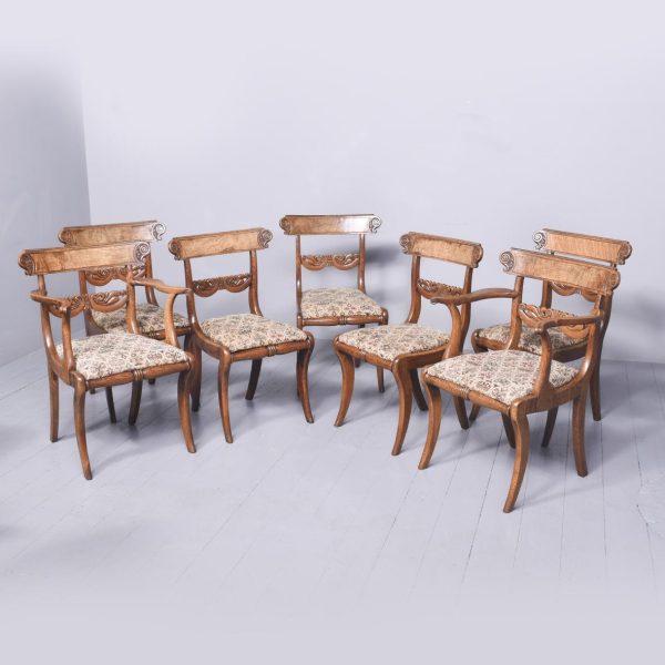 Circa 1810. Set of rare7 Regency pollard oak and elm dining chairs. Including two carvers with scrolled arms on shaped uprights and five single chairs. The broad top pollard oak rails with beaded decorations and acanthus carved sides above a lower foliate carved rails supported on curved uprights. The lift out seats covered in a quality tapestry in perfect condition. With moulded seat rails over sabre front legs and outswept rear supports. Beautiful colour and patina and all in excellent order.