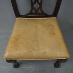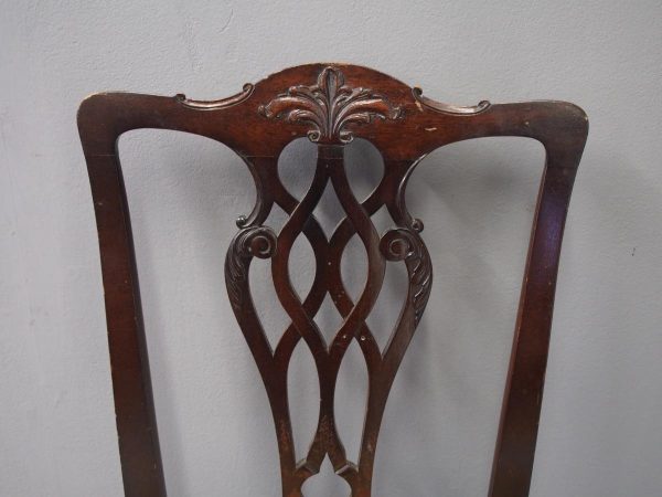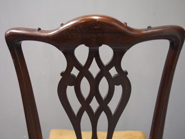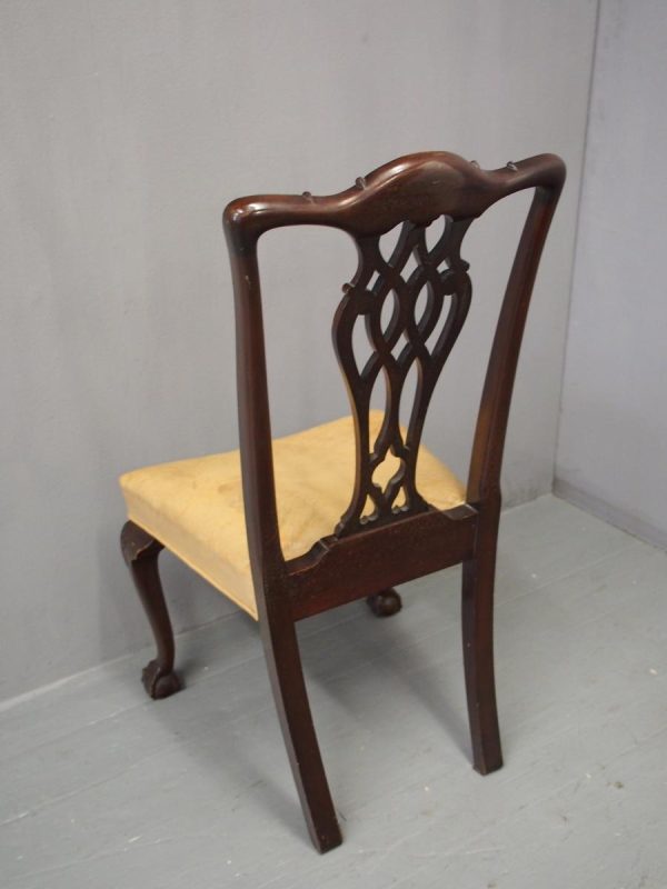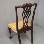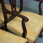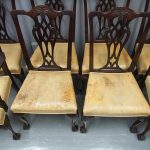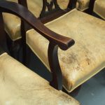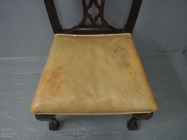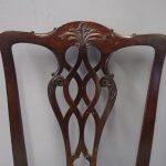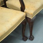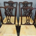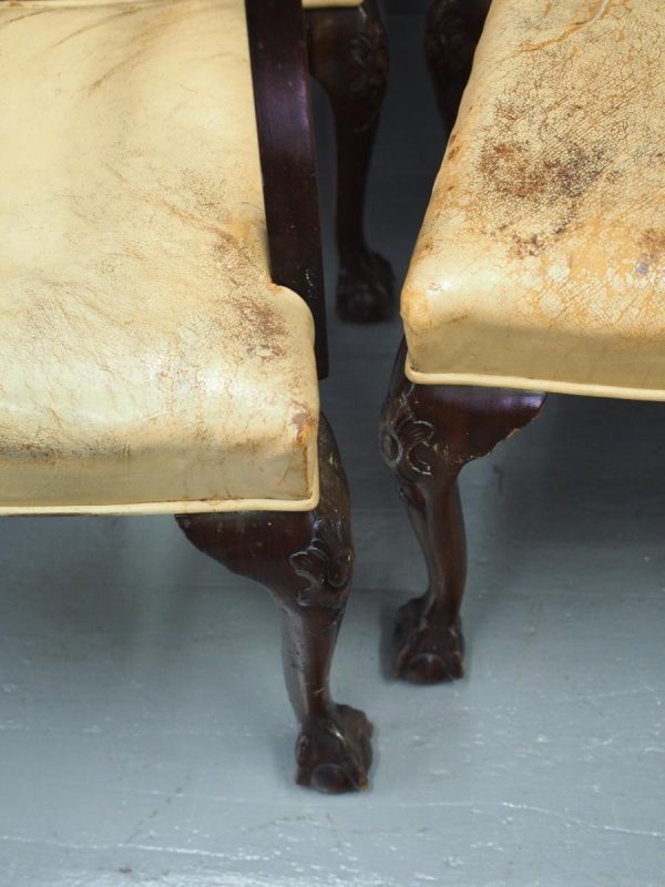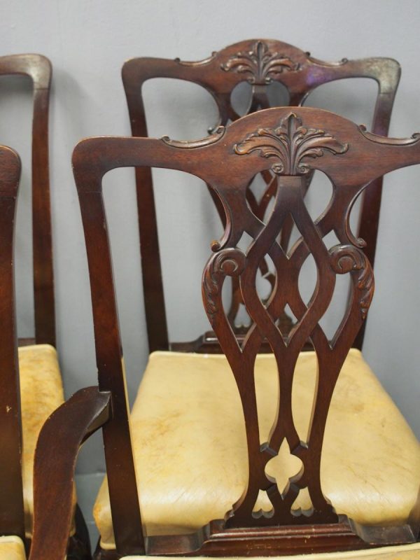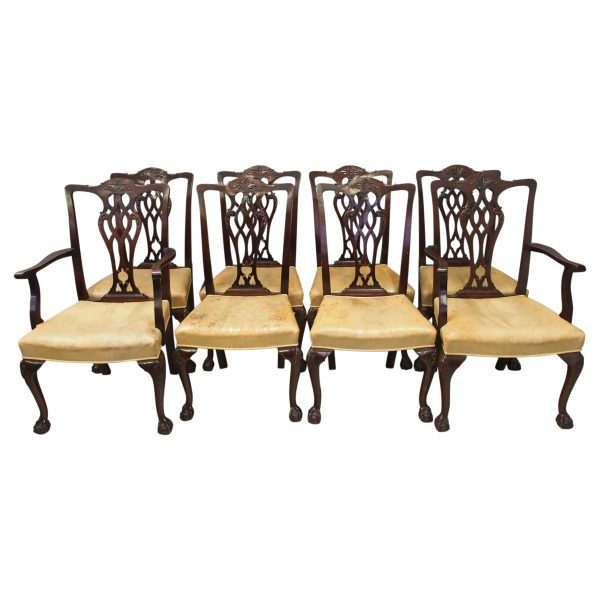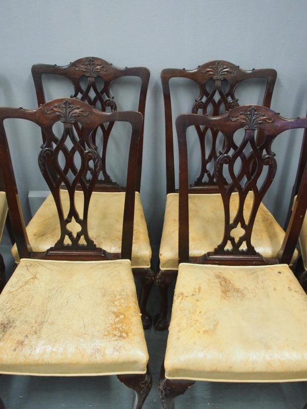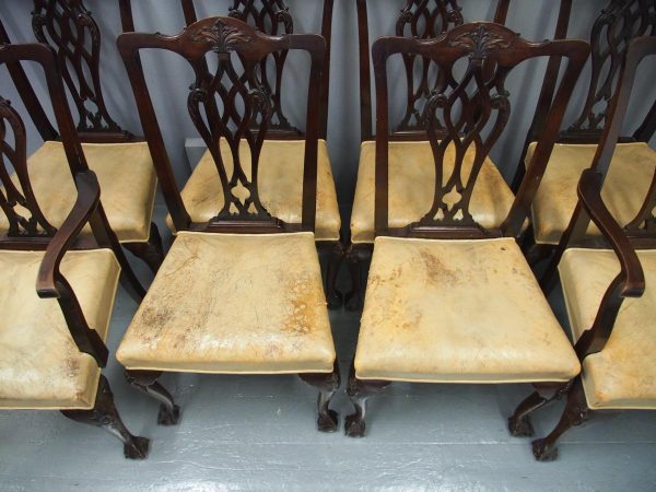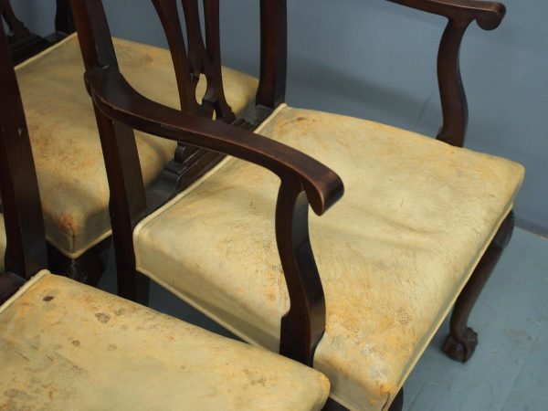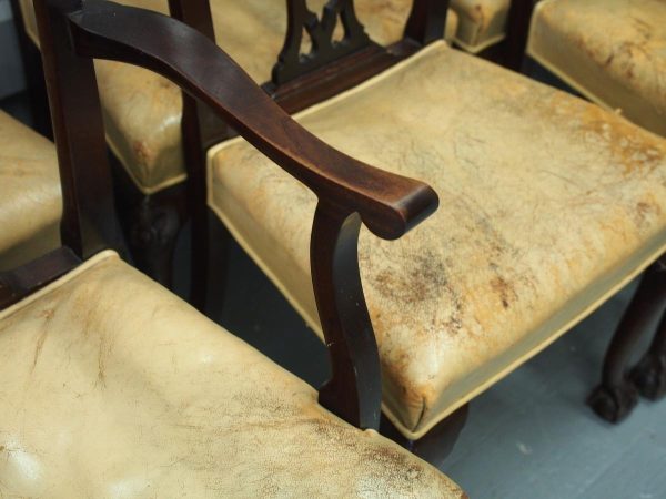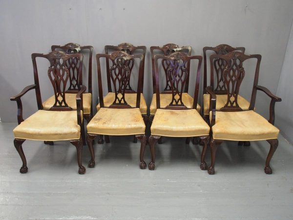 Circa 1900, set of 8 mahogany Chippendale style dining chairs, including 2 carvers. With a shaped top rail with foliate carving above a Chippendale-style latticed centre splat. With outswept arms on shaped supports, leading to deep upholstered seats in cream leather. These are supported on cabriole legs to the front with acanthus carved knees and ball and claw feet, and with outswept rear supports. The carvers are 58 cm wide and 56 cm deep.