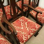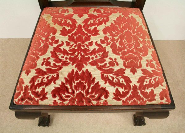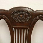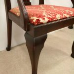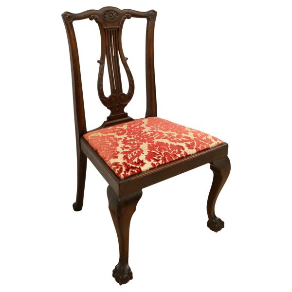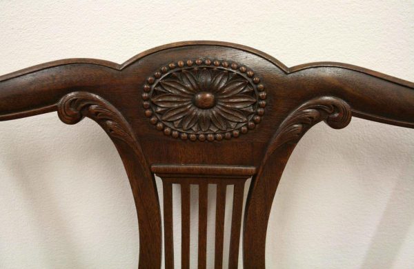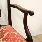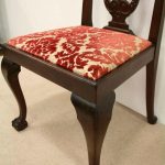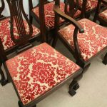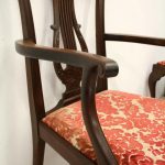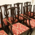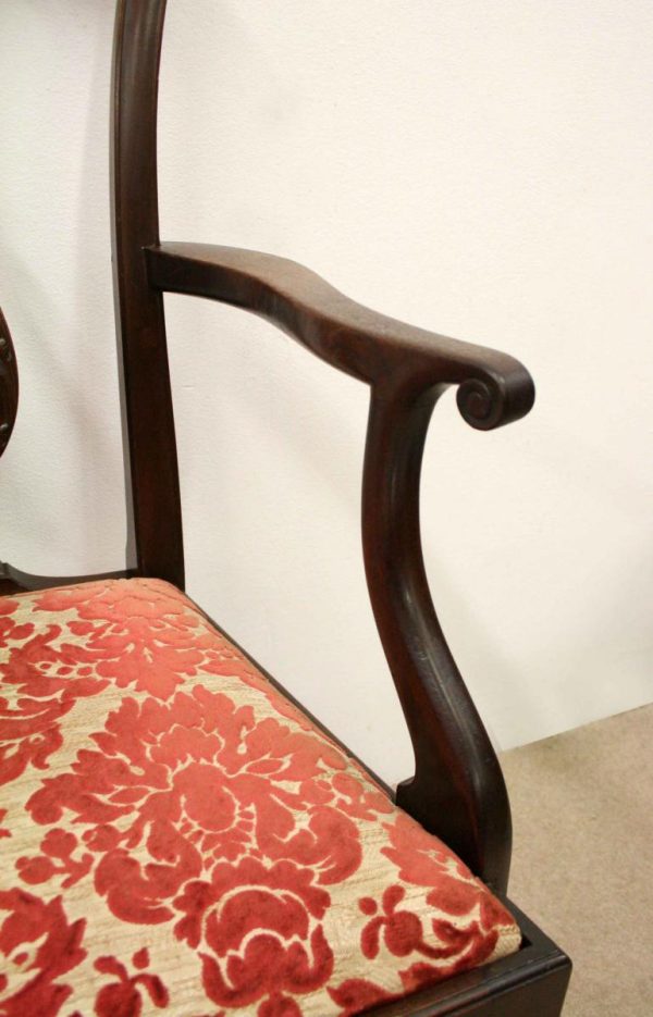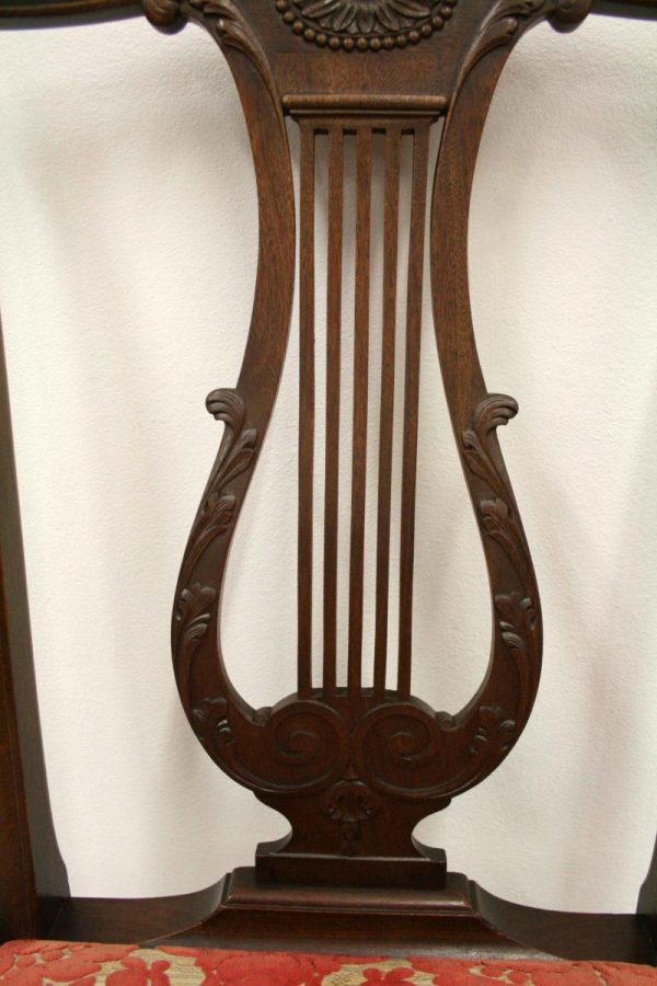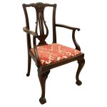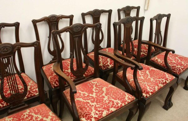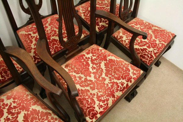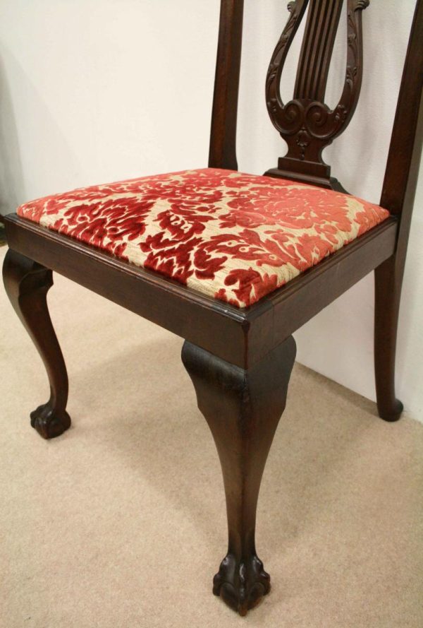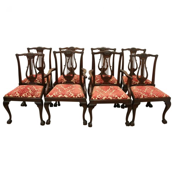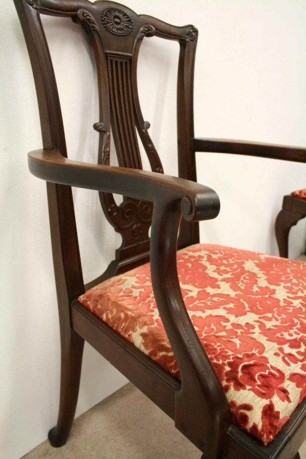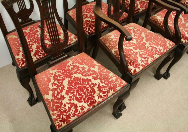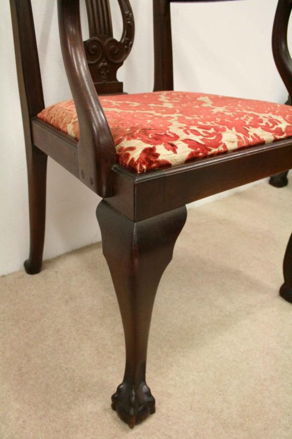 Circa 1890, set of 8 Georgian style mahogany chairs, consisting of 6 side chairs and 2 armchairs. The stylish shaped top has a carved shell in the centre surrounded by beading, over an open shaped back in the form of a lyre with foliate carving at the side and scrolling beneath. The armchairs have stylish shaped arms which finish in a scroll in the front, held in place by a turned upright. There is a drop in seat pad contained within a stylish frame with ogee moulding. The back legs are outswept and the front legs are cabriole finishing on ball and claw feet. Clean, sturdy and substantial sized.