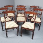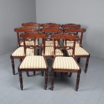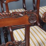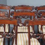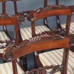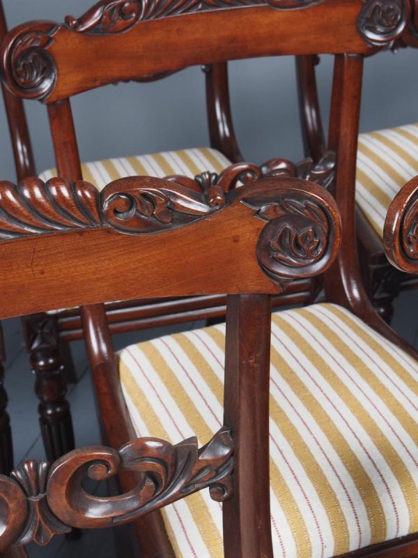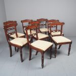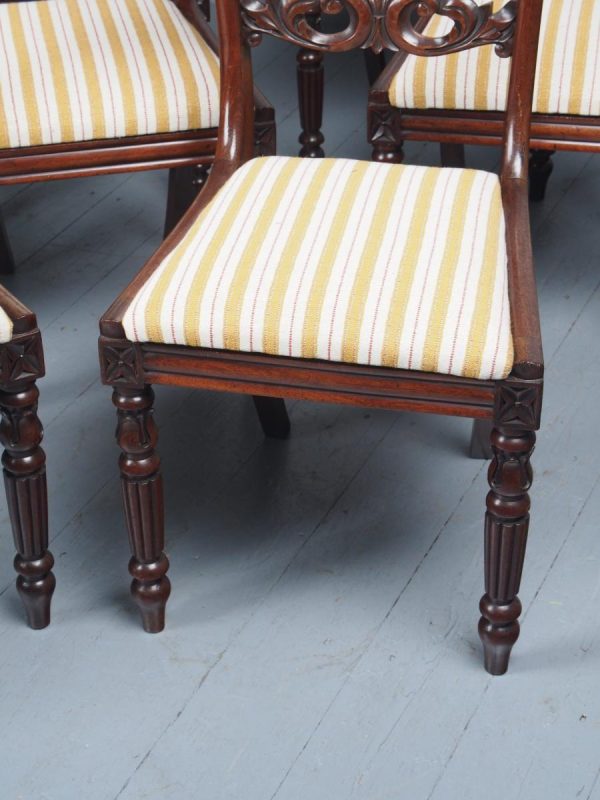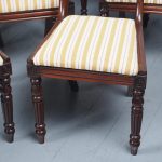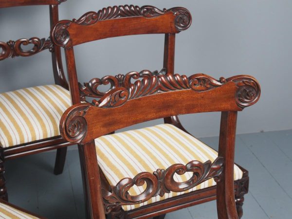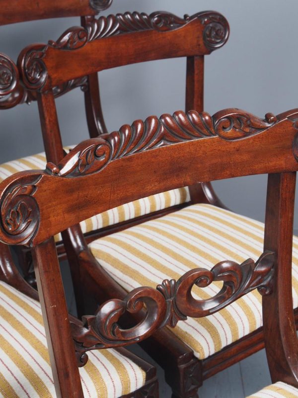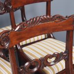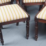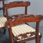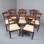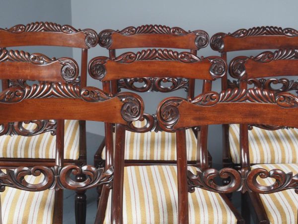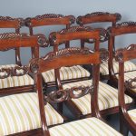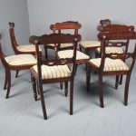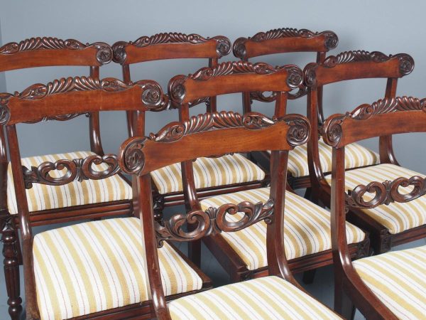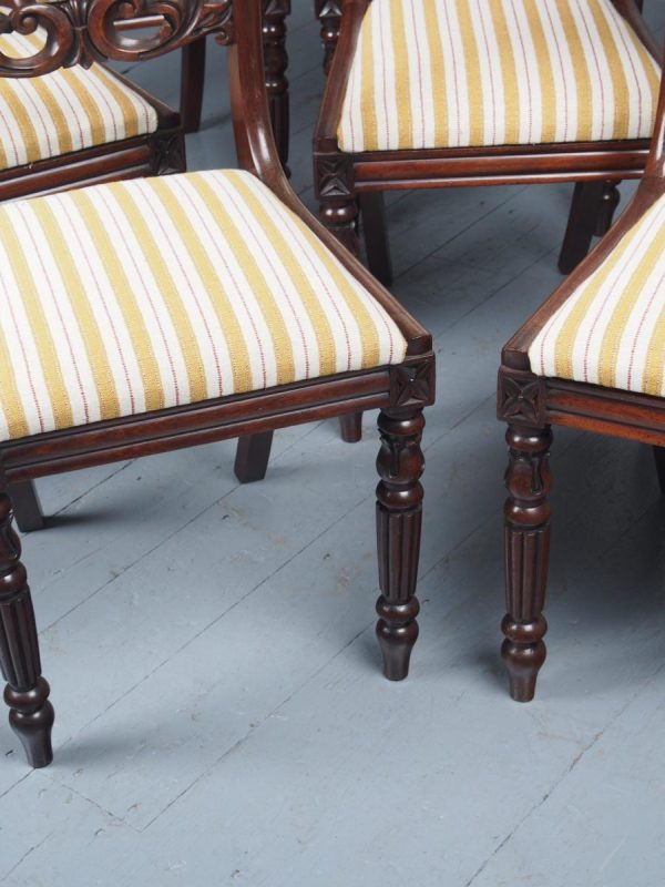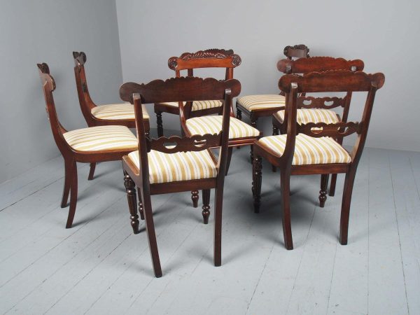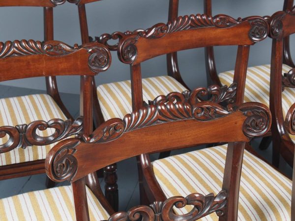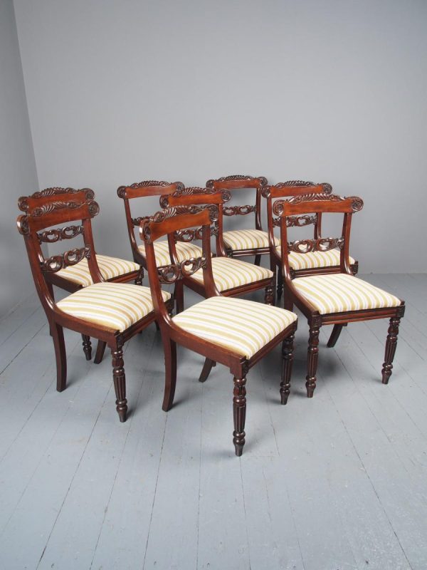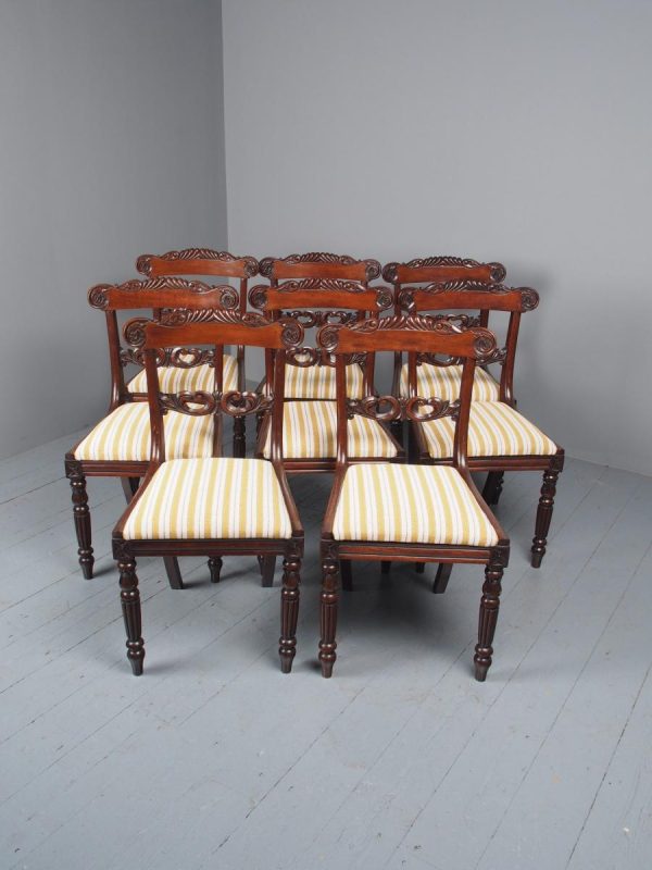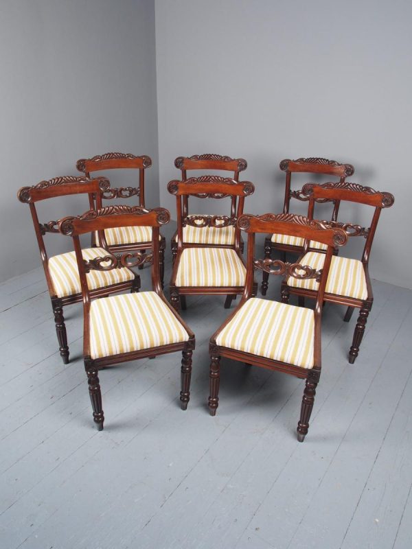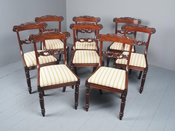Circa 1815, rare set of 8 Regency mahogany dining chairs. With shaped, curved top rail with foliate carving to the sides and gadrooning, over a pierced, foliate carved centre rail. The recently traditionally re-upholstered drop-in seat over a shaped seat rail (to front) with carved flower heads. On splayed back legs and Gillow’s style front legs which are carved, fluted and turned.
