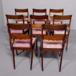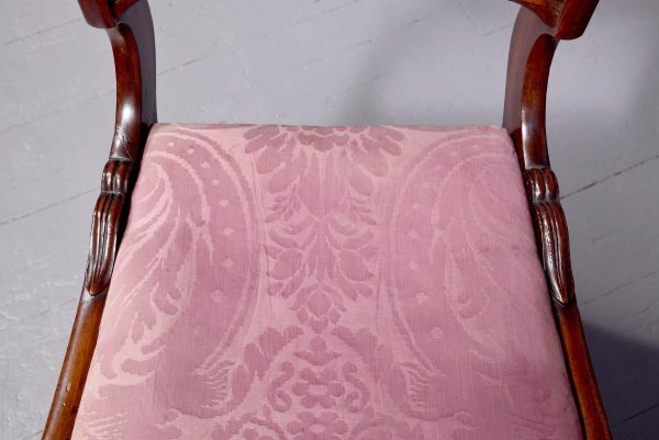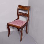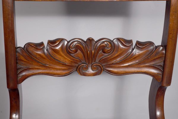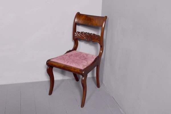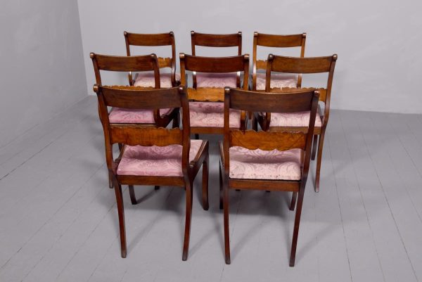 Circa 1820, Set of 8 Irish mahogany Regency dining chairs. The sloped back with the top rails in mirror-matched flame mahogany above acanthus-carved lower rails on shaped uprights extending forward as carved seat rails. With moulded flame mahogany front rails and supported on shaped front and out-swept rear supports with original dropout seats