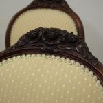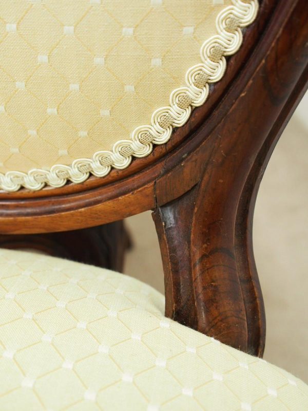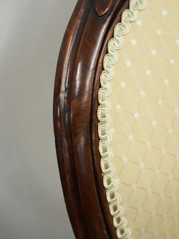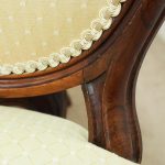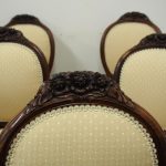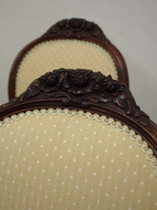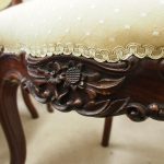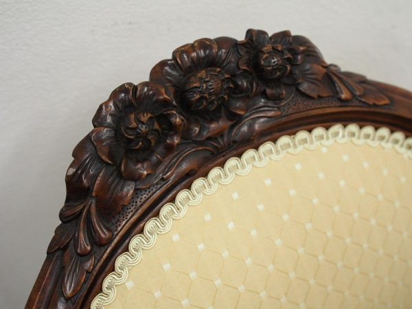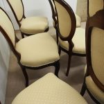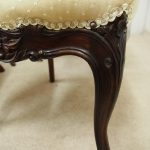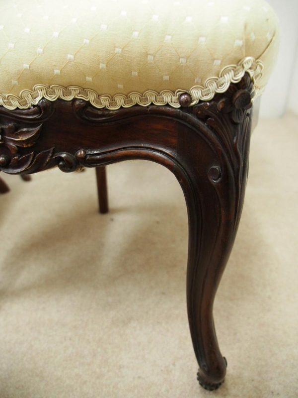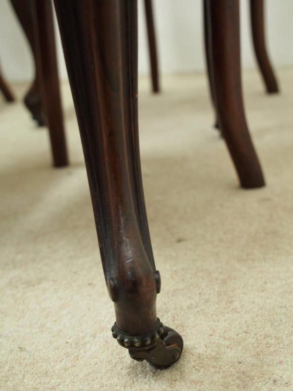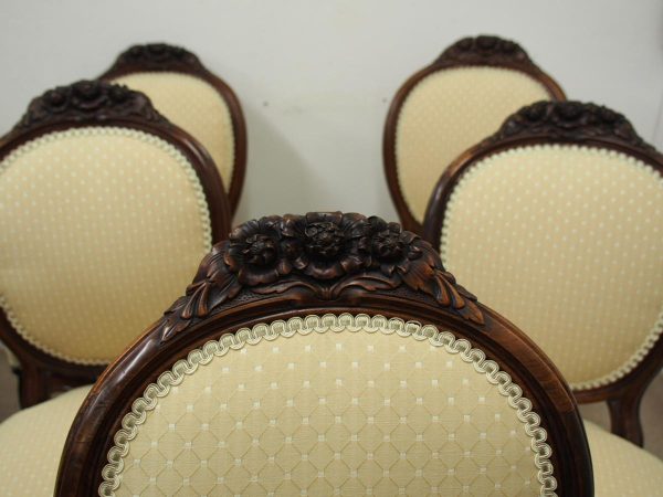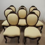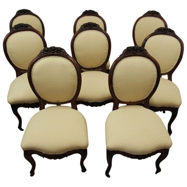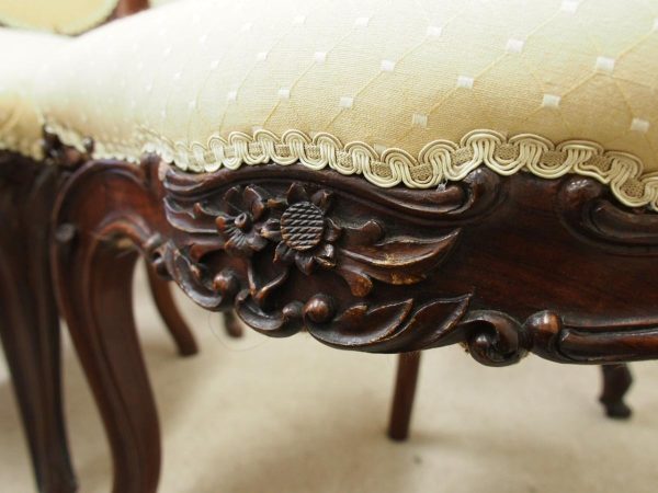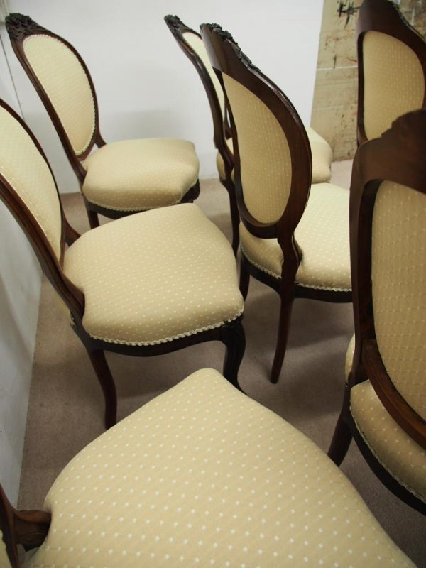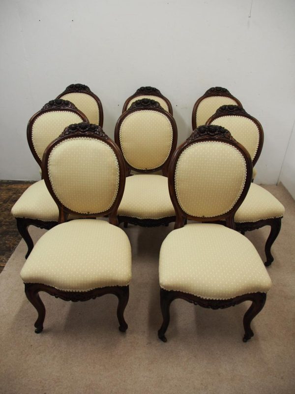 Circa 1870, set of eight Victorian carved mahogany cabriole leg dining chairs. The oval upholstered backs surmounted with a finely carved floral cartouche, generous size seats and beautiful floral carved frieze and all standing on elegant cabriole front supports. These chairs have just been traditionally upholstered from scratch, using horsehair and finest quality covering material.