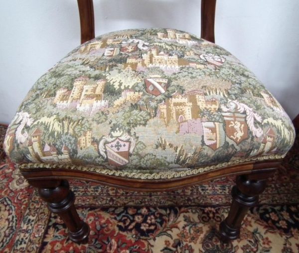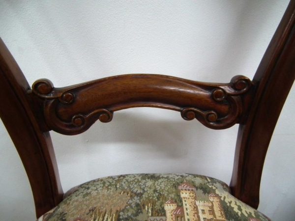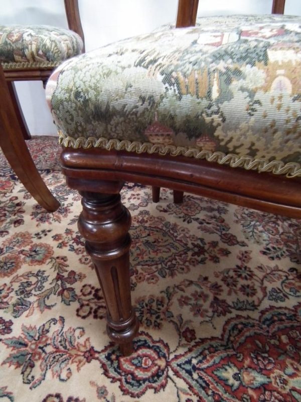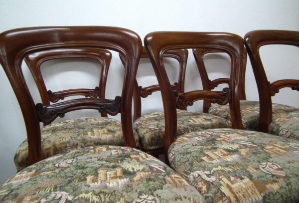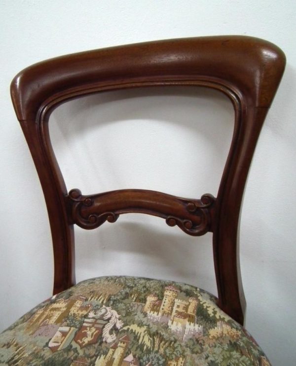 Circa 1870, set of 8 Victorian mahogany dining chairs, with a curved and shaped top rail with a beaded edge. The stuff over seat has serpentine front and a reeded frieze below. The chairs stand on turned and fluted legs at the front and swept legs at the back. Excellent condition.