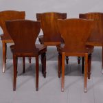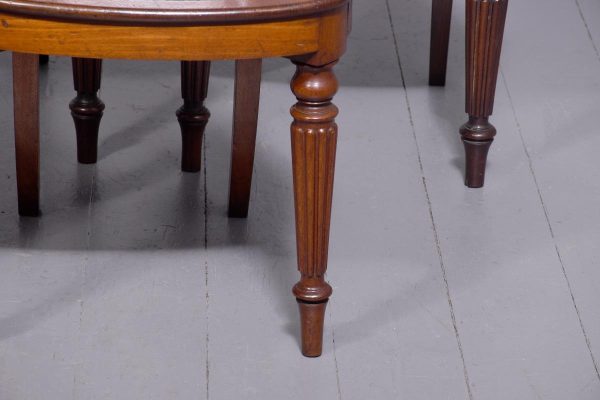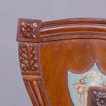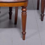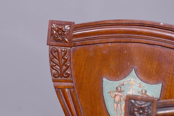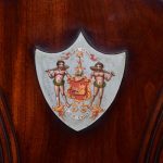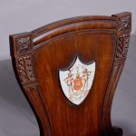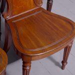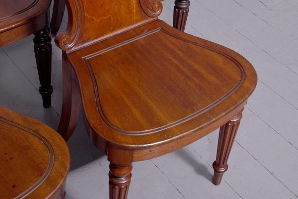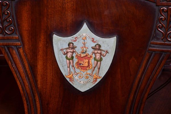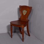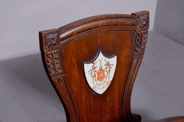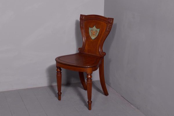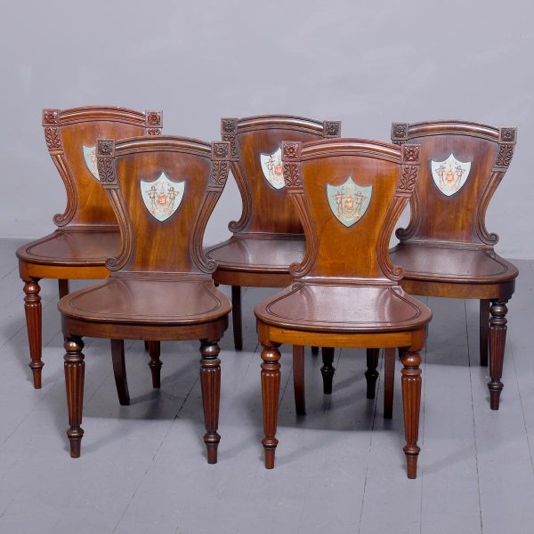 Circa 1820. A quality matched set of 5 George IV mahogany and painted hall chairs, the shaped solid back with hand-painted crest of the clan ‘Chisholm’ above a solid seat on turned dragooned legs, the set comprising of three earlier examples and a pair of later chairs, of generous proportions with great colour and patina.
