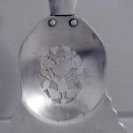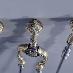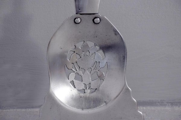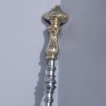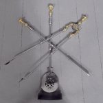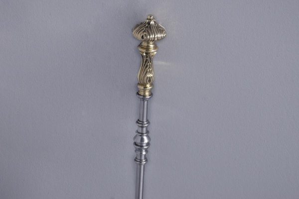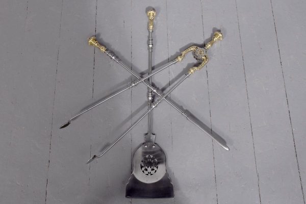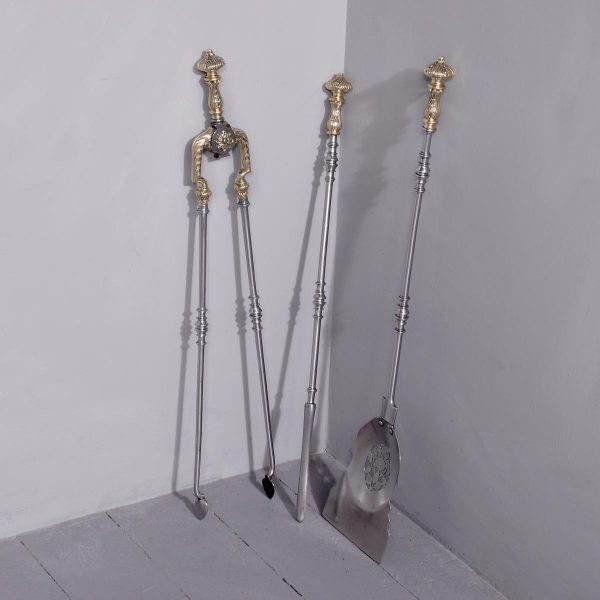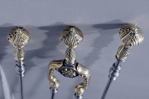 Circa 1810. A set of Exhibition quality George III fireside tools, consisting of porker, tongs and pierced shovel with wonderful shape, with foliate cast brass handles surmounted by an elegant finial, the center of the poker with elegant cast brass flower heads on each side with flower heads on each side.