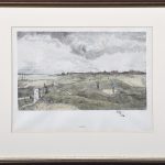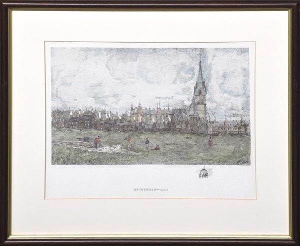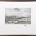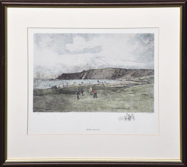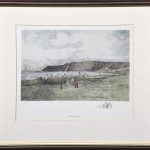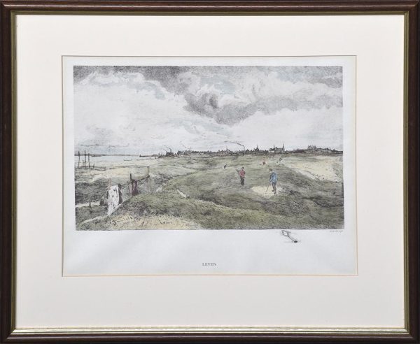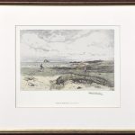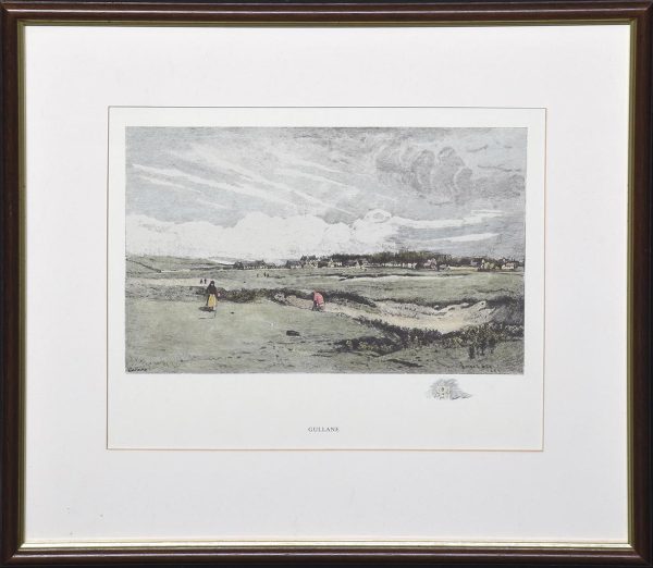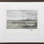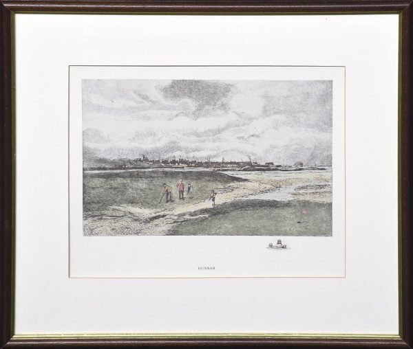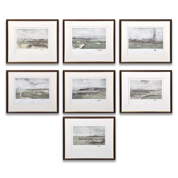 Circa 1970s. Set of 7 framed golfing prints after John Smart. The iconic set framed with large mount and a gilt slip, glazed in a dark wood frame. Including North Berwick, Dunbar, Gullane, Leven, Elie, Machrihanish and Bruntsfield. All the frames in excellent condition.