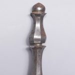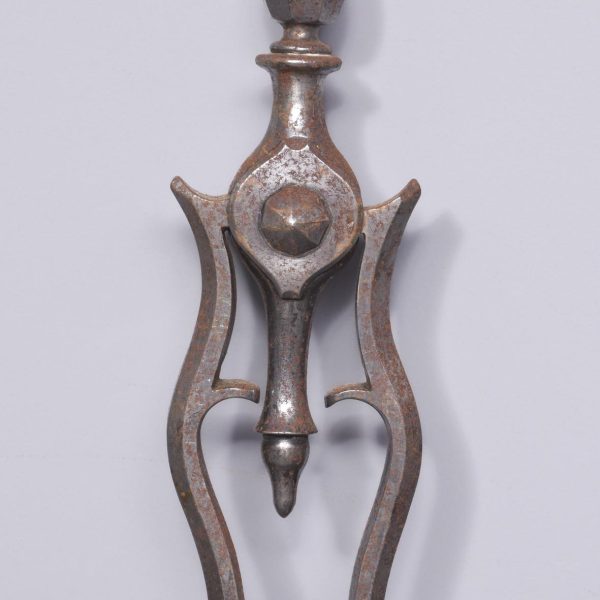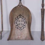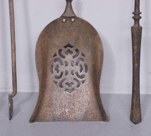 Circa 1800, the set includes a pair of tongs, a shovel, and a poker, with waisted octagonal handles.