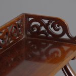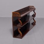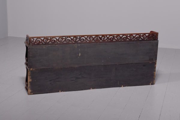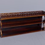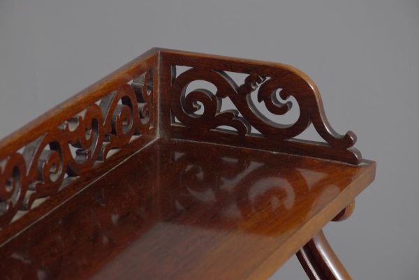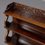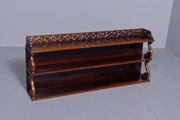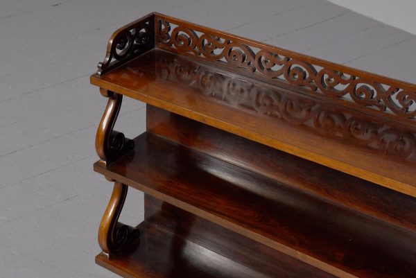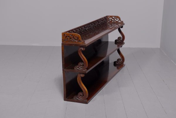 Circa 1840. An unusual and stylish set of rosewood shelves, the top with a 3/4 pierced gallery, with three shelves each supported on scrolling uprights all with a polished back, the shelves taper in-depth from top to bottom.