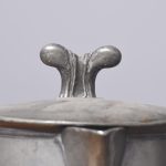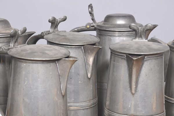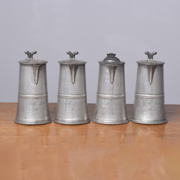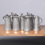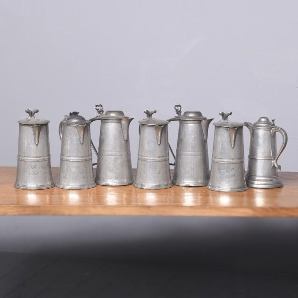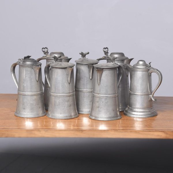 Seven various pewter lidded flagons, four dated 1788, of standard classic form with hinged lid scrolling lifting handle with an out-swept tail, most have the makers mark stamped to the inside of the, including ‘Gardner,’ all with good colour patination (1 loose lid).